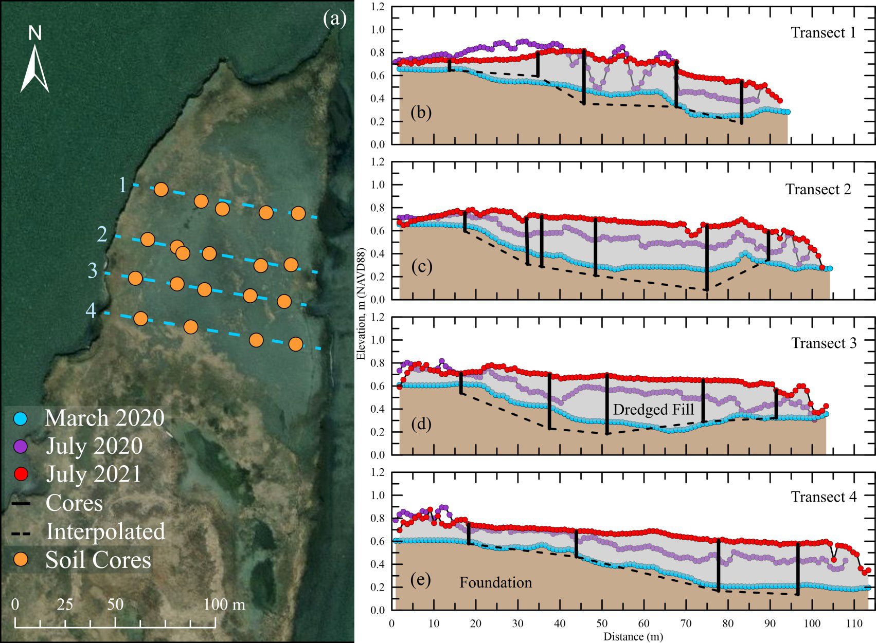 Figure 4. (A) Map of soil core transects, and (B–E) Elevation transects across the placement area from March 2020, July 2020, and July 2021. Solid black lines and dashed black lines indicate the depth of dredged fill at coring locations and the interpolated wetland foundation from cores, respectively. Brown and gray shaded regions represent native wetland foundation and dredged material, respectively.
