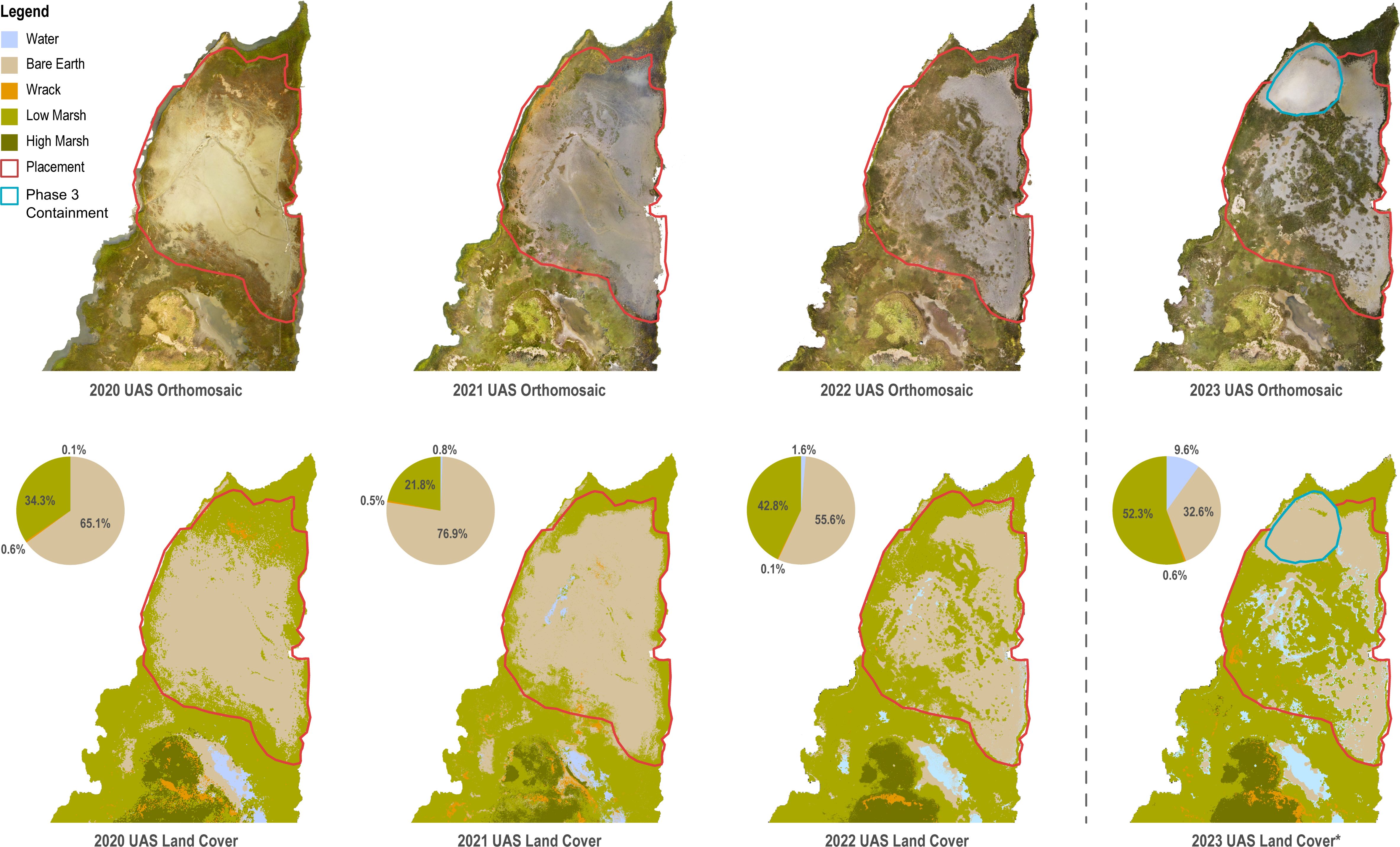 Figure 5. Orthomosaic surveys and land cover classifications from September 14, 2020; August 23, 2021; August 26, 2022; and September 9, 2023. Land cover classifications consisted of water, bare earth, wrack, low marsh, and high marsh with a red boundary line denoting the approximate nourishment area. For 2023 UAS Land Cover* the percentages exclude the Phase 3 placement area since additional dredged material was placed here, altering the vegetation cover.