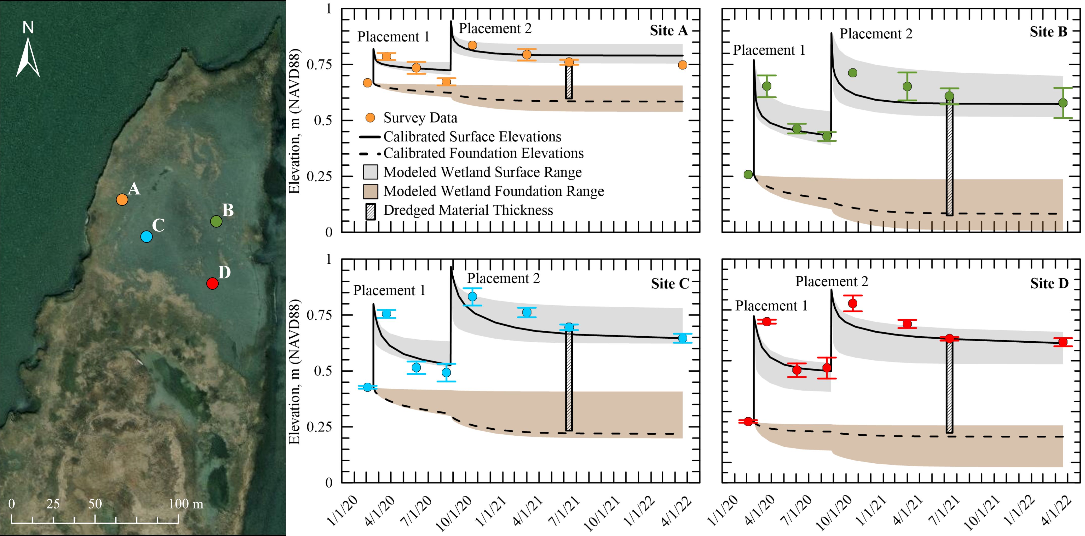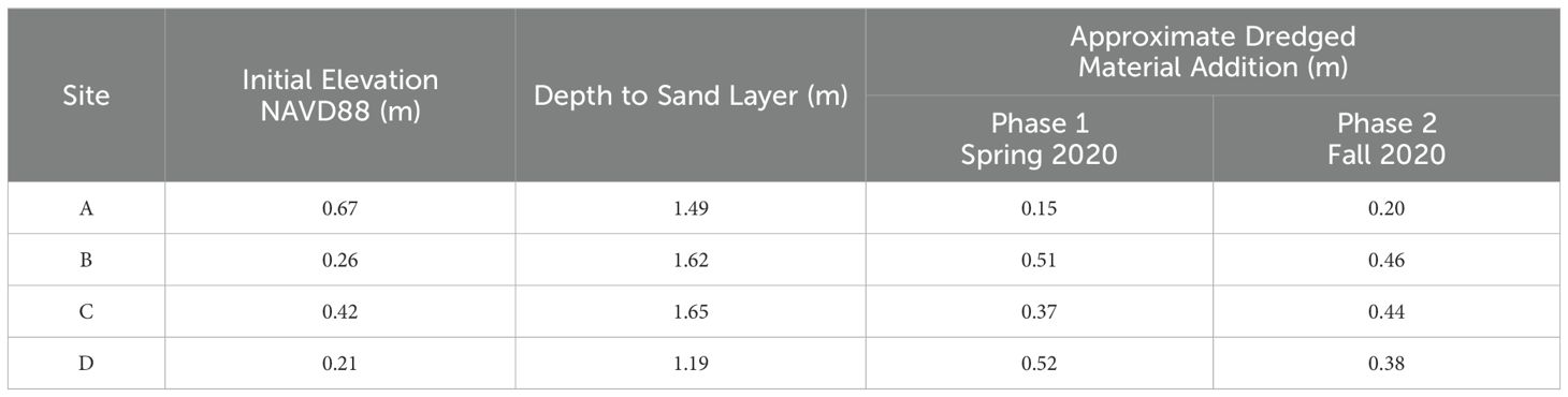 Four specific sites were chosen for consolidation modeling. These sites were selected to cover a range of initial elevations (0.21-m to 0.67-m, NAVD88); depth to sand (1.19-m to 1.65-m), and approximate dredged material thicknesses for both nourishments (low: 0.15-m at Site A; high:0.52-m at Site D). Dredged material thicknesses are approximate values as site access was restricted immediately after dredging concluded. Table 2 provides a summary of values for each site. A range of dredged material and foundation surface elevations was modeled to hindcast a highly compressible, quickly draining scenario and less compressible, slowly draining scenario to encompass the uncertainty in laboratory results. Due to limited field data for the foundation layer, only the compression index (Cc) was varied and not the permeability. Permeability values for the dredged material layer ranged by an order or magnitude in both ways to account for uncertainties in laboratory derived measurements (Tavenas et al., 1983a; Jafari et al., 2019c). The Cc ranged from a less compressible Cc = 0.25, determined from standard oedometer results to a more compressible Cc = 2.10, determined from moisture content relationships (Cc = w(%)/100; Mesri and Ajlouni, 2007) collected on Sturgeon Island prior to dredged material placement. The consolidation models were calibrated through an iterative process of matching overall dredged material elevations, which includes consolidation of the dredged material and underlying foundation, to the field survey points and the July 2021 soil core data which provided the elevation of the foundation, allowing for the calibration of the foundation layer.