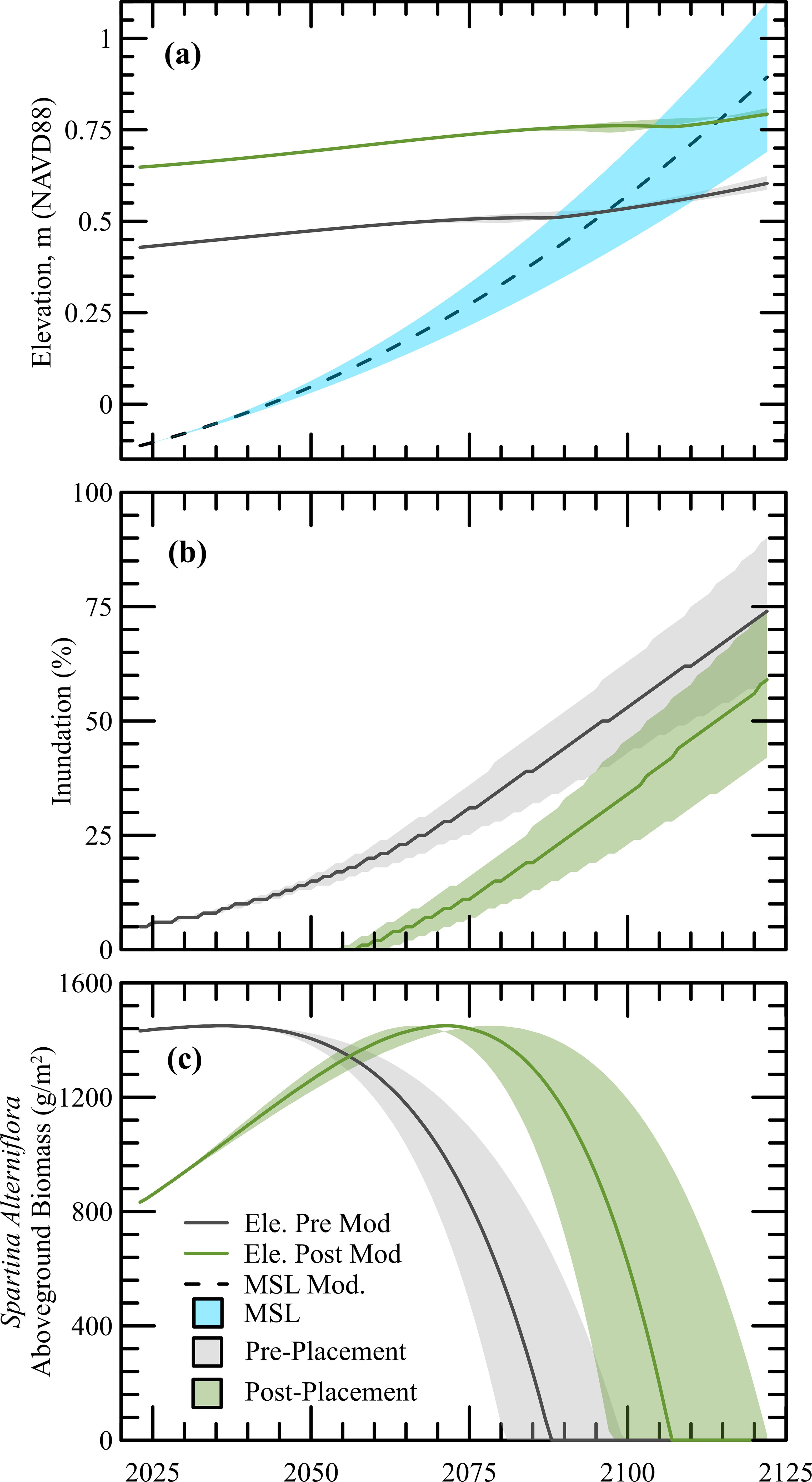 Figure 8. Comparison of (A) wetland surface elevation, (B) percent inundation, and (C) S. alterniflora aboveground biomass pre- and post-dredged material placement for Site C Shaded bands represent the range of low to high sea level rise rates with the solid line representing the moderate scenario.