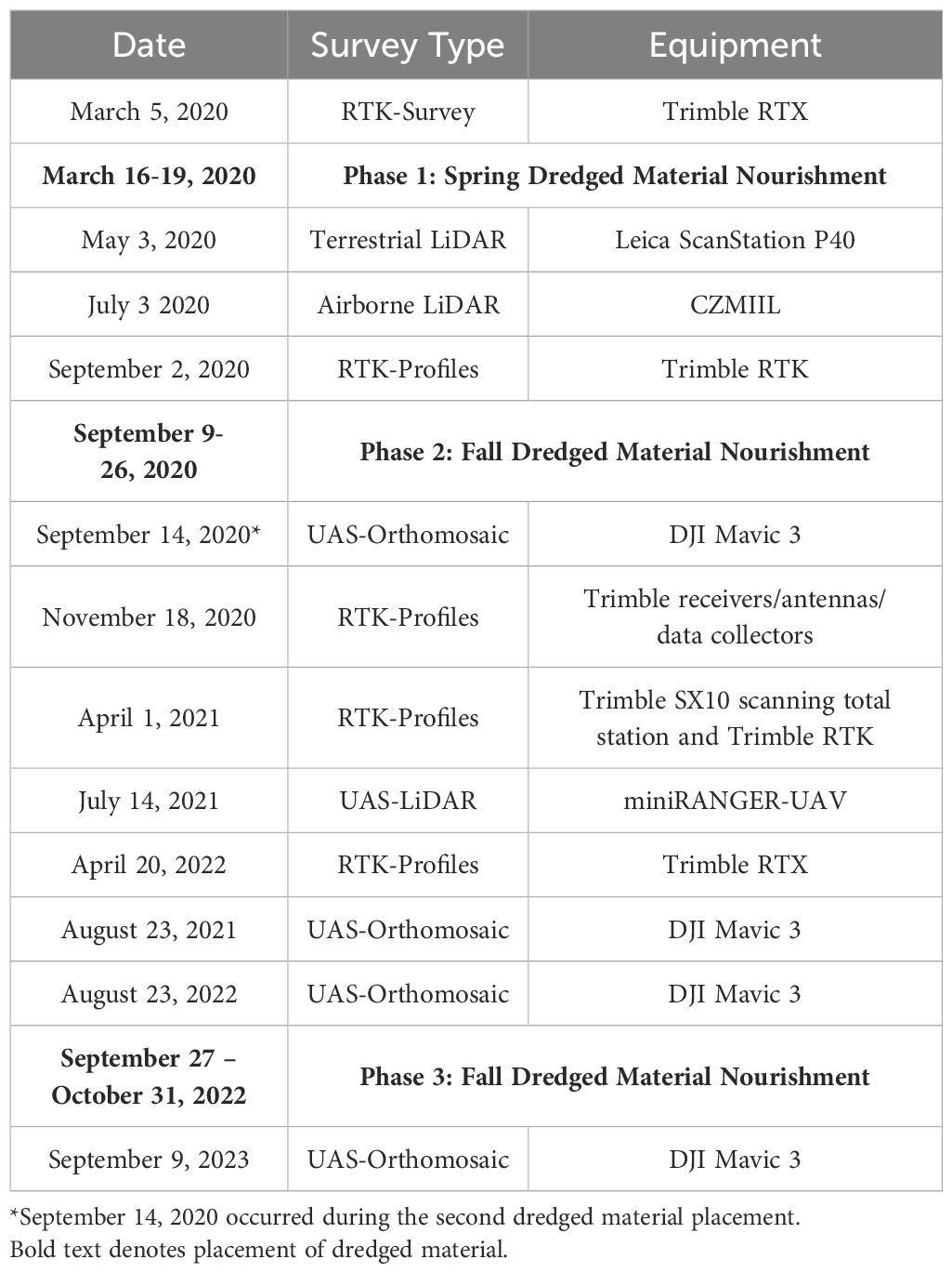 Table 1. Timeline of survey types and equipment on Sturgeon Island, NJ utilized in this study and dredged material placement windows.
