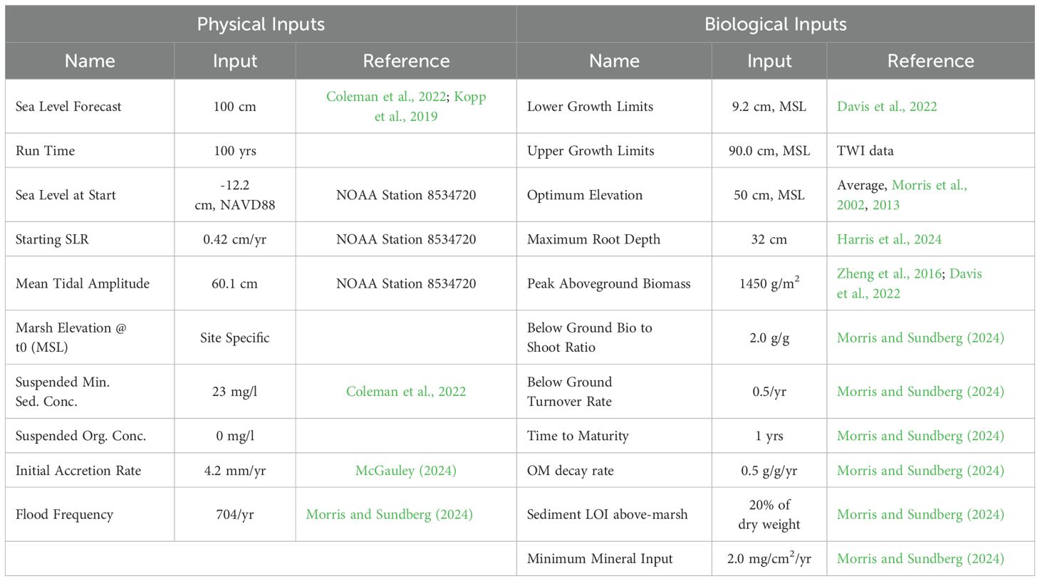 Site C was selected to be used within CWEM as dredged material and compressible foundation thicknesses were close to an average among the four sites modeled for consolidation. An initial SLR rate of 0.4 cm/yr was selected (NOAA, 2024) and to account for variations in SLR projections, low, moderate, and high values were used, corresponding to 0.8 cm/yr, 1.0 cm/yr, and 1.2 cm/yr, respectively (Kopp et al., 2019). Table 3 provides a summary of physical and biological inputs used and their respective references for the pre-BUDM placement at Site C and moderate SLR scenario.