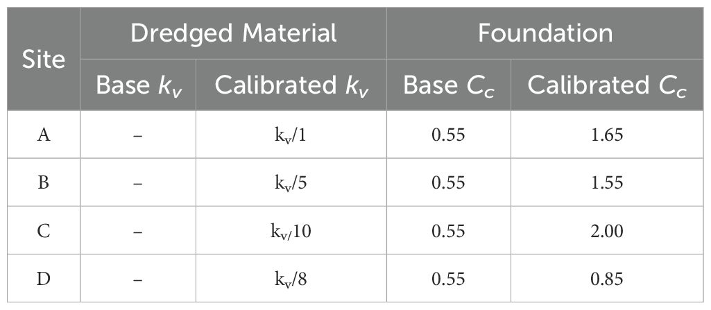 Table 4. Summary of base and calibrated values for relevant permeability (kv) and compression index (Cc) values.