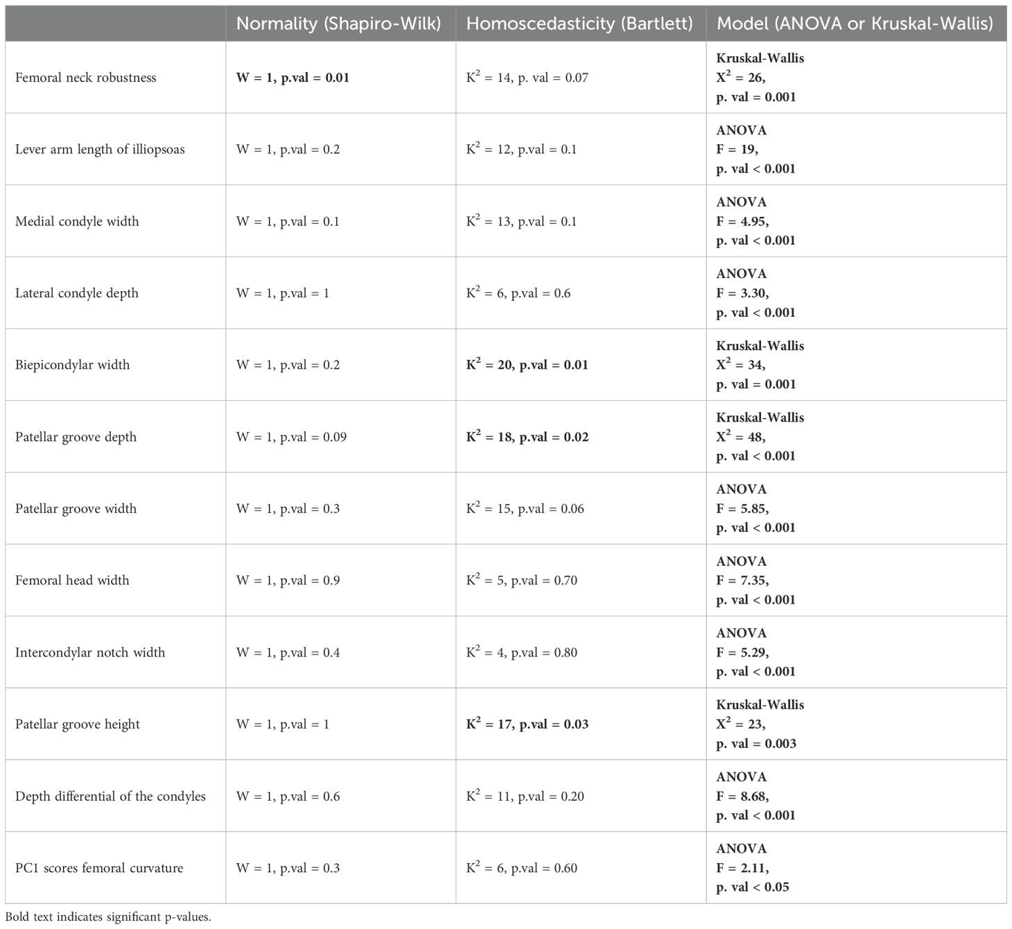 To assess shape differences between taxa, we computed n = 12 morphometric ratios that quantify the superoinferior robustness of the neck, the anteroposterior robustness of the femoral neck, the anteroposterior expansion of the femoral head, the relative length of the iliopsoas lever arm, the relative depth, height and width of the patellar groove, the relative anteroposterior depth of the lateral condyle, the depth differential of the lateral and medial condyle, the relative mediolateral width of the medial condyle, the relative mediolateral width of the intercondylar notch and the biepicondylar dimension.