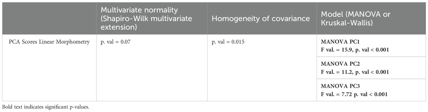 We computed analysis of variance (ANOVA) and multivariate analysis of variance (MANOVA) to evaluate whether extant taxa can be significantly discriminated based on morphometric ratio values and PC scores, respectively. We set the levels of significance of our tests at 5%. ANOVA were computed using the aov function of stats and MANOVA using the manova function (R Core Team, 2024). Prior to ANOVA, we tested the following assumptions: i) there is no significant differences in data normality between the dependent variables and ii) there is no significant differences in data homoscedasticity between the dependent variables (Table 1). Normality of the model residuals was assessed using the Shapiro-Wilk test with the shapiro.test function of stats (R Core Team, 2024). Homoscedasticity of the data was evaluated using the bartlett.test function of stats (R Core Team, 2024). A particular attention was given to homoscedasticity as ANOVA is robust to non-normality of the data. In cases where we failed to validate homoscedasticity, we used the non-parametric Kruskall-Wallis and permutational MANOVA (PERMANOVA) tests. The Kruskall-Wallis test was applied using the kruskal.test function of stats and PERMANOVA using the adonis function of vegan (Oksanen et al., 2001). We ran post-hoc tests following MANOVA and PERMANOVA. For ANOVA, we used the Tukey’s Honest Significant Difference (HSD) with the TukeyHSD function of stats. For Kruskall-Wallis, we used the Dunn’s Test with the dunnTest function of FSA (Ogle et al., 2023).