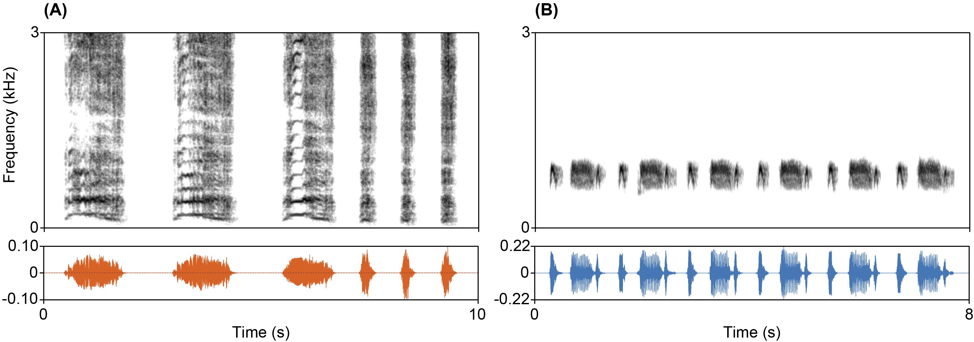 Figure 1. Spectrograms and oscillograms of acoustic stimuli used in the playback experiment. (A) Lion (Panthera leo) vocalization sequence (recorded by Timmy Moser), consisting of three full roars followed by three grunts. The mean harmonic-to-noise ratio (HNR) of this stimulus was 5.3 dB. (B) Ring-necked dove (Streptopelia capicola) stimulus composed of six coo calls with a mean HNR of 19.6 dB. Spectrograms were generated in Praat using a fast Fourier transform (FFT) method with a dynamic range of 55.0 dB. Window length was set to 0.08 s for the lion stimulus and 0.03 s for the dove stimulus.