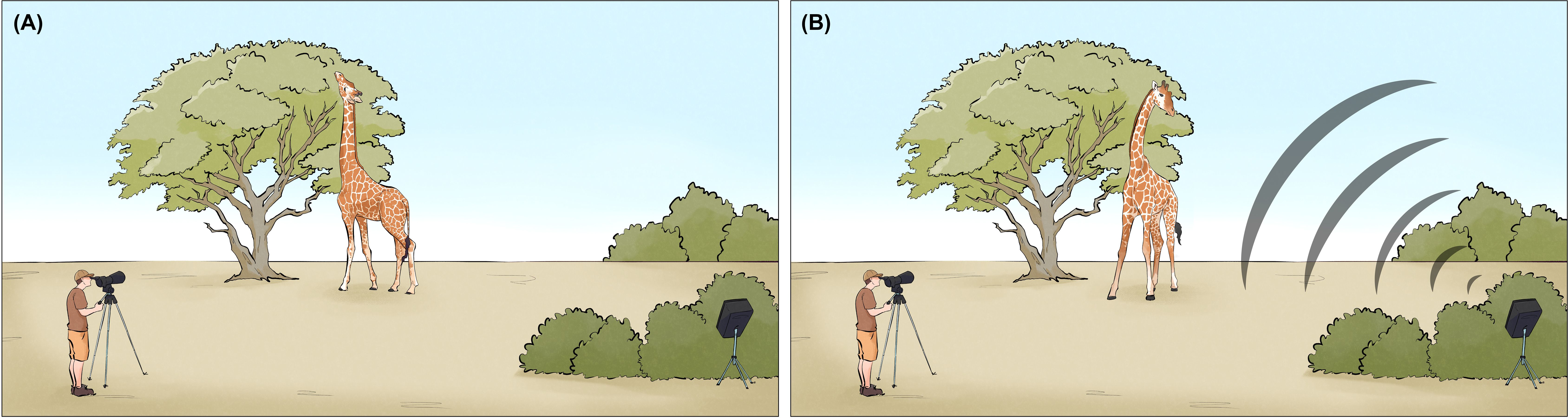 Figure 2. Experimental setup of a playback. (A) The focal giraffe feeds stationary at a tree, (B) and turns toward the hidden speaker responding to a lion roar-grunt sequence. Figure reproduced from Baotic and Szipl (2025), BMC Biology, under the terms of the Creative Commons Attribution 4.0 International License (CC BY).