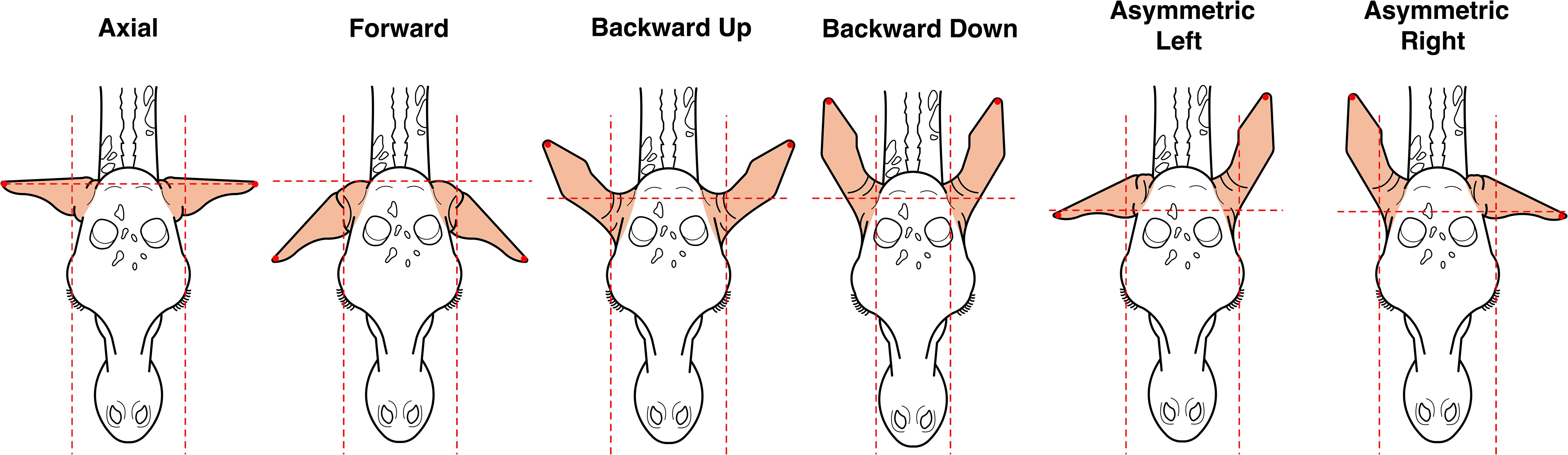 Figure 3. Illustrations of giraffe ear postures used for behavioral classification. Axial: Both ears extended laterally, forming an approximate 90° angle relative to the head-to-tail axis. Forward: Ears angled forward, deviating more than 30° above the horizontal plane, directed toward the giraffe’s front. Backward-Up: Ears angled backward and elevated above the neck line, exceeding 30° from the horizontal. Backward-Down: Ears directed rearward and downward, positioned at or below the level of the neck. Asymmetric Left/Right: One ear points backward while the other ear remains either forward or laterally extended (axial), creating a clear left–right asymmetry. Figure reproduced from Baotic and Szipl (2025), BMC Biology, under the terms of the Creative Commons Attribution 4.0 International License (CC BY 4.0).