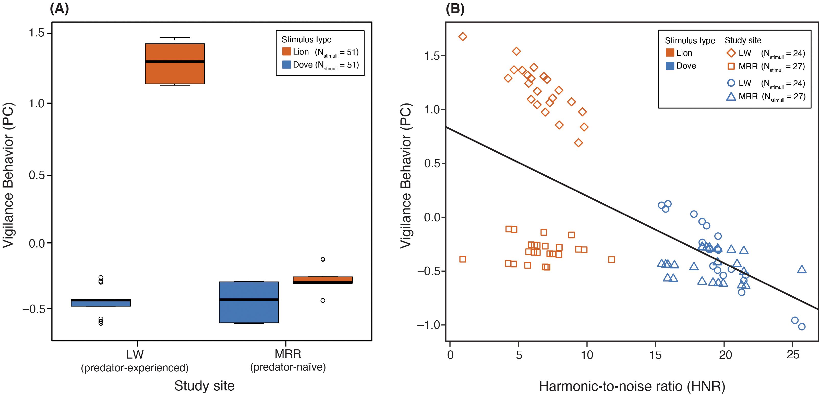 To further examine whether HNR effects simply reflected species identity, we tested for a relationship between HNR values of lion calls and giraffe vigilance responses (PC scores) within lion trials only (N = 51). This correlation was not significant (Spearman’s ρ = 0.013, p = 0.929), indicating that variation in HNR among lion calls did not predict vigilance responses. Thus, the effect of HNR on response strength primarily reflects the broad contrast between lion and dove calls rather than within-species variation.