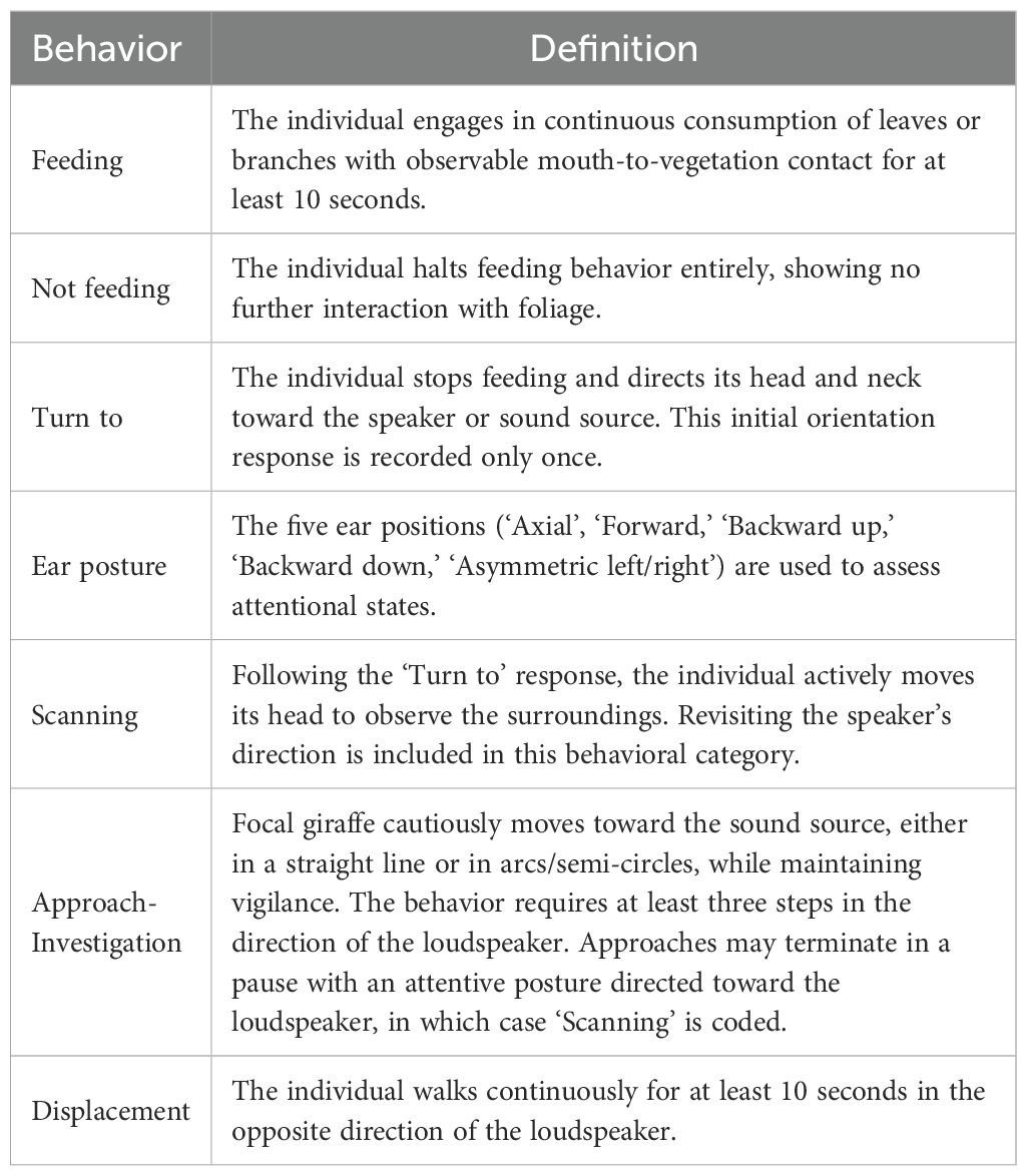 Behavioral responses were recorded using a Sony FDR-AX53 video camera. Videos were later coded frame-by-frame (20 ms resolution) using Solomon Coder 17.03 for Windows. We used continuous sampling and recorded the duration (in seconds) of predefined behavioral categories including ‘Feeding’ (mouth attached to foliage and feeding continuously for ≥10 s), ‘Not feeding’ (cessation of feeding), ‘Turn to’ (orienting toward the sound source), ‘Scanning’ (stationary vigilant posture with head/neck raised, screening/monitoring environment), ‘Approach-Investigation’ (cautious movement toward the sound source), ‘Displacement’ (walking continuously in the opposite direction of the loudspeaker for ≥10 s), and five ear postures indicative of attentional state (illustrated in Figure 3). We note that ‘Approach-Investigation’ is considered a vigilance response in giraffes, reflecting cautious investigative movements toward a novel or potentially threatening stimulus rather than attraction (Langman, 1977). Behavioral definitions followed an ethogram previously established and validated in (Baotic and Szipl, 2025), with full behavioral definitions provided in Table 1. If the focal giraffe exhibited displacement behavior, the playback trial was considered complete. If the focal giraffe showed displacement behavior by walking continuously in the opposite direction of the loudspeaker for at least 10 seconds, the playback trial was considered complete.