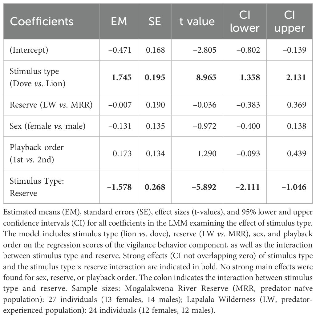 To examine how giraffes respond to predator cues, we fitted a LMM to PC scores representing the ‘vigilance behavior’ component, with descriptive statistics of the underlying behavioral measures provided in Supplementary Table S1. The model included fixed effects for stimulus type (lion vs. dove), reserve (LW vs. MRR), sex, playback order, and the interaction between stimulus type and reserve. The model significantly outperformed the null model containing only the random intercept (Likelihood ratio test: χ²(5) = 78.513, p < 0.0001).