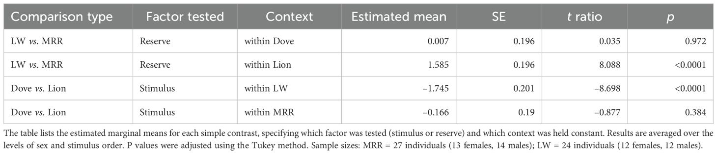 Pairwise comparisons of estimated marginal means (Tukey-adjusted) confirmed that vigilance responses to lion calls were significantly stronger at the predator-experienced reserve (LW) than at the predator-naïve site (MRR; β = 1.585, SE = 0.196, t = 8.088, p < 0.0001), whereas responses to dove calls did not differ between reserves (Table 4). As shown in Figure 4A, vigilance-related PC scores were clearly elevated during lion trials at LW, while individuals at MRR (predator-naïve) showed little differentiation between the two stimuli.