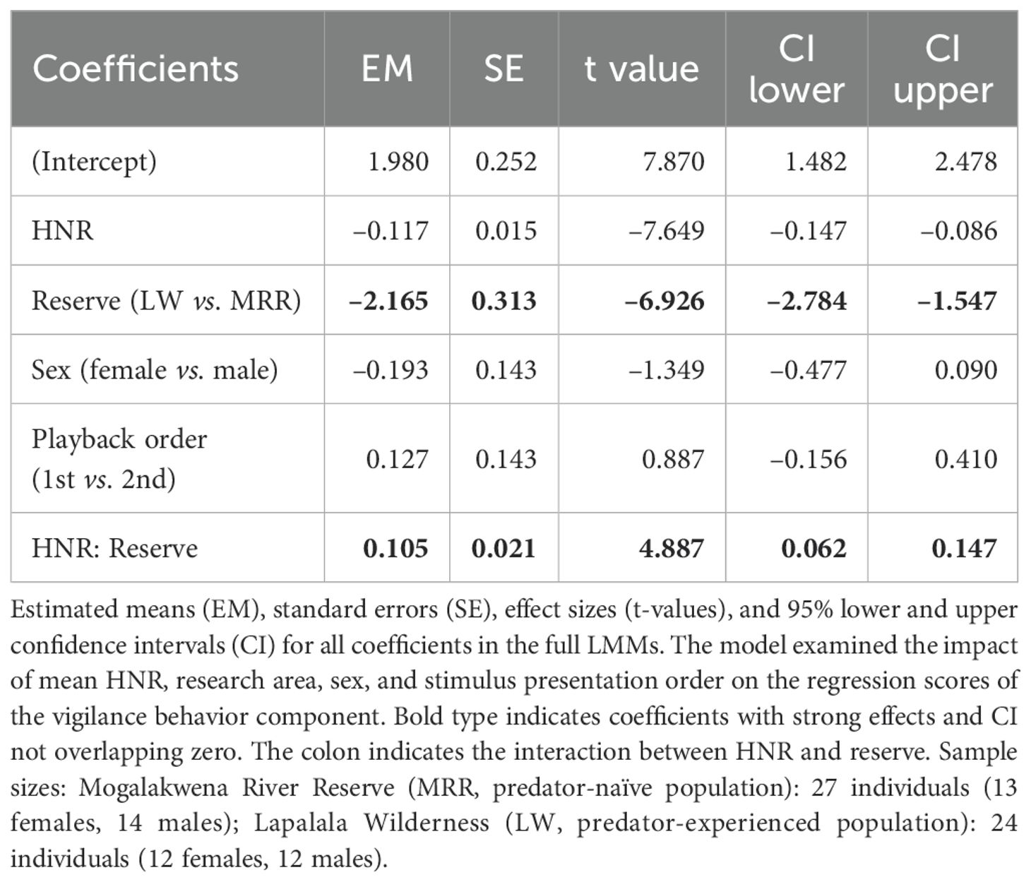 The second LMM assessed whether acoustic features of the stimuli, particularly the harmonic-to-noise ratio (HNR), influenced giraffe vigilance behavior, as represented by PC regression scores. The full model included HNR, reserve (LW vs. MRR), sex, stimulus order, and the HNR × reserve interaction as fixed effects, with giraffe ID as a random factor. Compared to the null model, the full model explained significantly more variation in vigilance behavior (LRT: χ²(5) = 65.818, p < 0.0001).