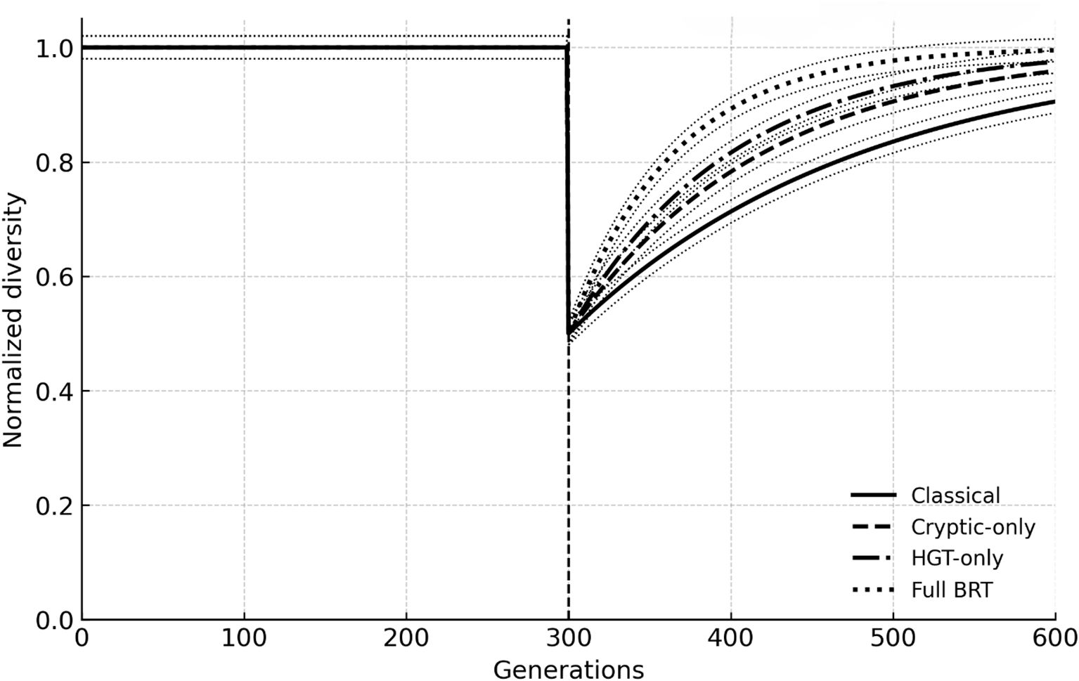 Figure 1. Post-extinction recovery trajectories across scenarios. Median normalized diversity through time (n = 3 runs) under a 50% extinction pulse (vertical dashed line). Classical (mutation + selection), cryptic-only, HGT-only, and full BRT (balancing + cryptic + HGT + eDNA) are shown with 95% confidence ribbons.