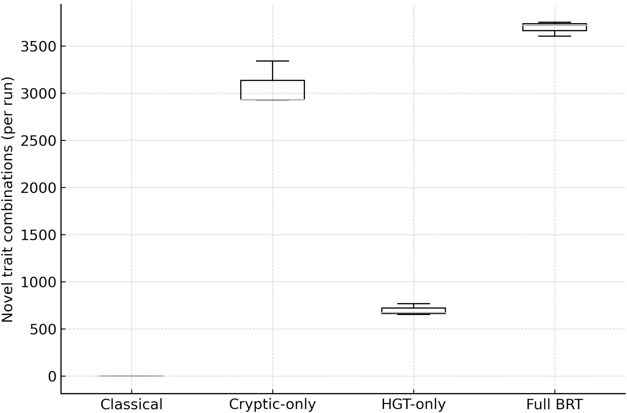 Figure 2. Innovation (novel genotype combinations per run) by scenario. Distribution of novelty across Classical, Cryptic-only, HGT-only, and full BRT. BRT yields the highest innovation; cryptic-only contributes the majority of combinations; HGT-only adds unique architectures.