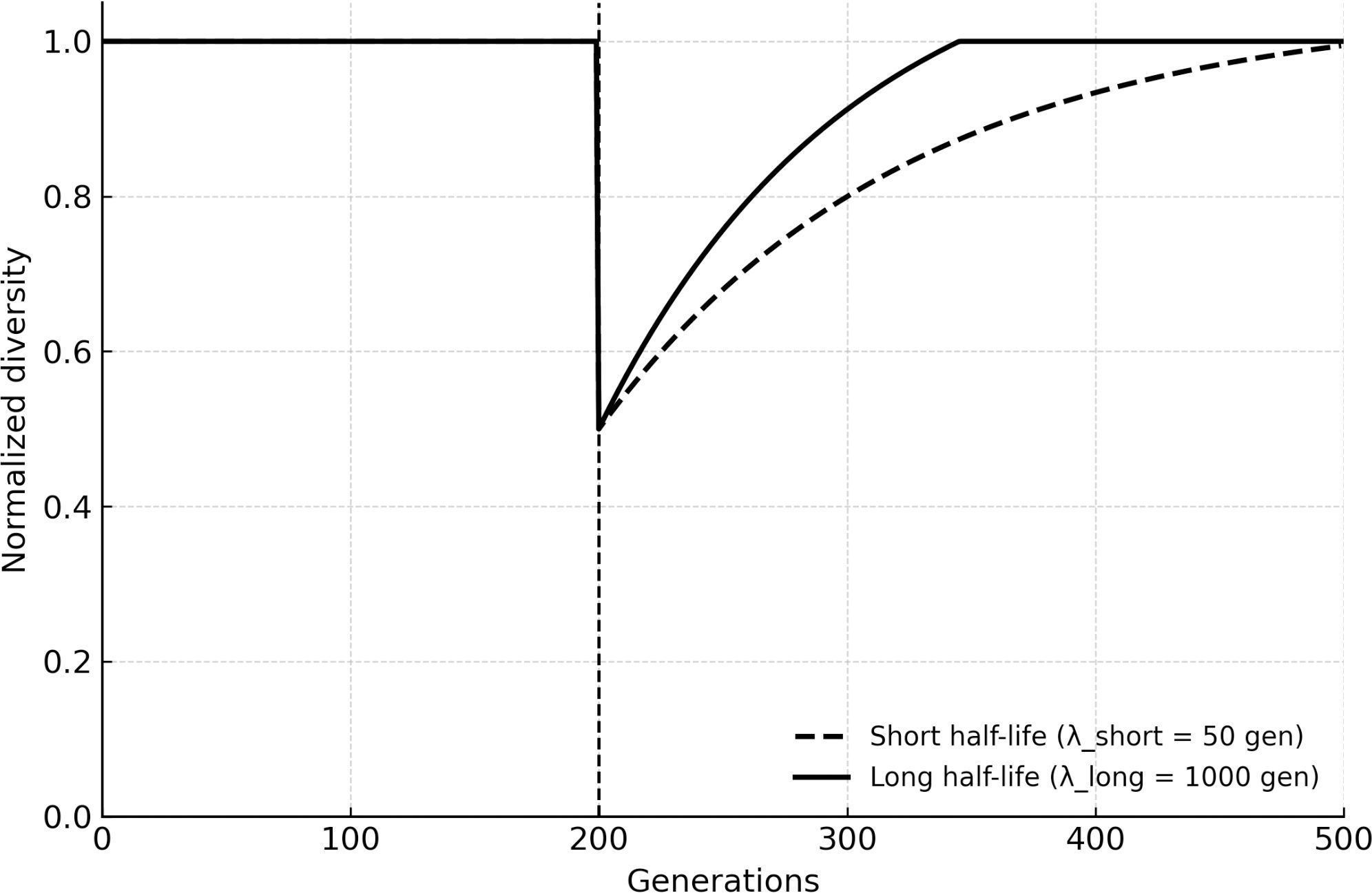 Diversity vs. generations comparing short (50 gen) vs long (1000 gen) eDNA half-life; long half-life maintains higher diversity.