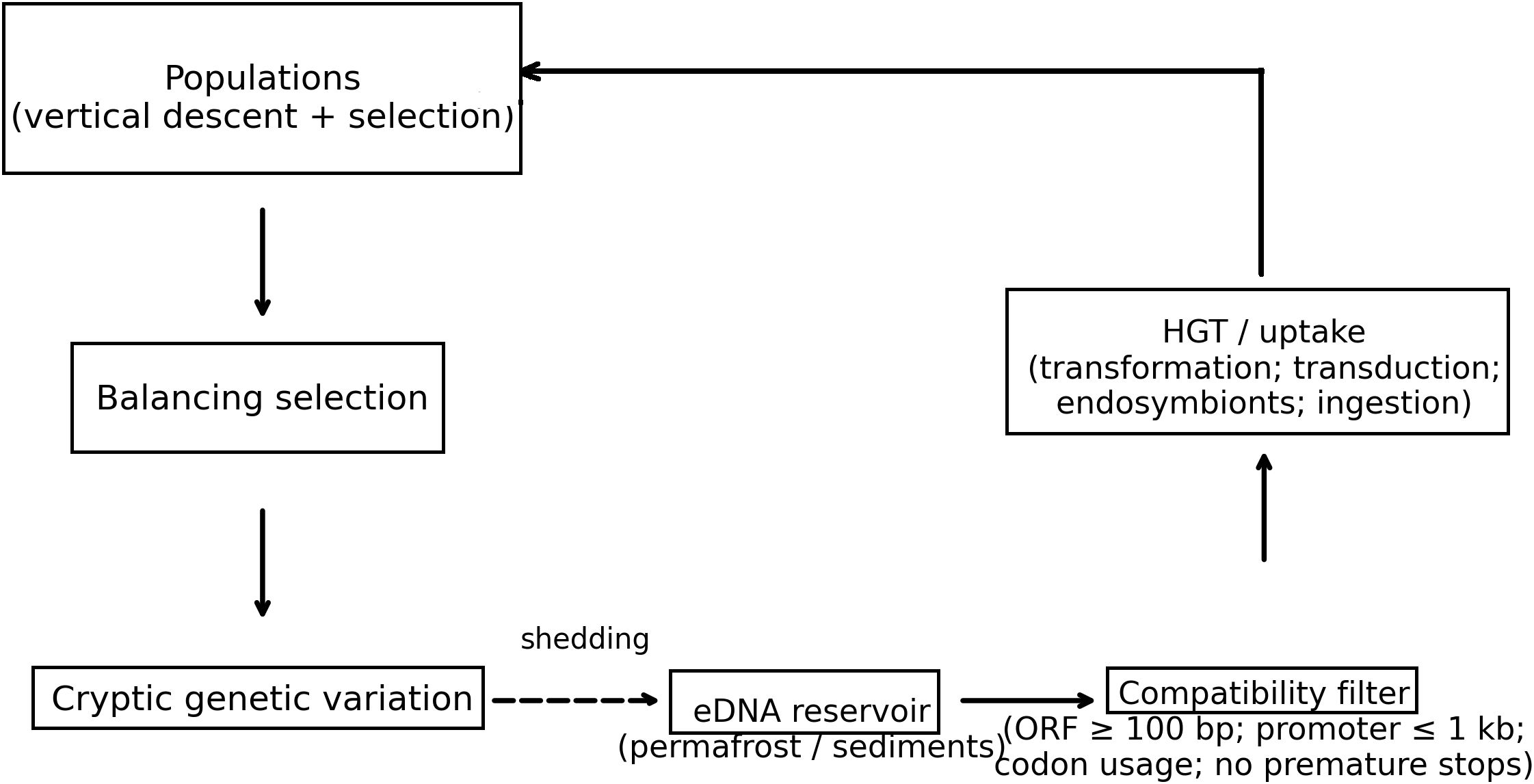Figure 4. Mechanistic schematic of Biological Recycling Theory (BRT). Vertical descent + selection maintain lineages; balancing selection preserves polymorphisms; cryptic variation remains latent until environmental shifts; alleles shed to eDNA reservoirs (permafrost/sediments) re-enter via HGT/uptake (transformation, transduction, endosymbionts, ingestion) subject to a compatibility filter (e.g., ORF ≥ 100 bp, promoter proximity ≤ 1 kb, codon usage compatibility, no premature stops).