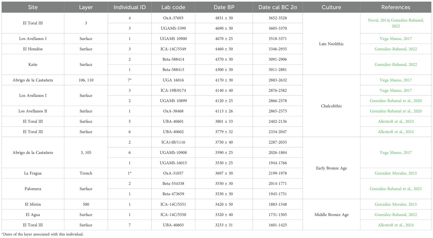 Dental calculus was available on teeth belonging to 21 of the 39 individuals anthropologically identified in 10 burial caves located in coastal and inland areas of the Cantabrian Region (Figure 1), a Eurosiberian biogeographical area located in the northern Atlantic Iberia, separated from the Spanish central plateau and the Ebro valley by steep, high mountains, running parallel to the coast and reaching their highest summits 2500m above sea level. It has an oceanic climate, with year-round rainfall and relatively limited seasonal temperature variation. The archaeological sites studied here are located in three administrative Spanish provinces: Asturias, Cantabria and Burgos. In terms of the chronocultural framework, the individuals have been directly dated by C14-AMS between 3700–1500 cal BC (González-Rabanal, 2022) and ranging from the Late Neolithic to the Middle Bronze Age. In total, we have analyzed six individuals dated in the Late Neolithic, six individuals dated in the Chalcolithic, six individuals dated in the Early Bronze Age and three individuals dated in the Middle Bronze Age (Table 1). Detailed information about the archaeological and osteological evidence of the sites is included in Supplementary Text 1.