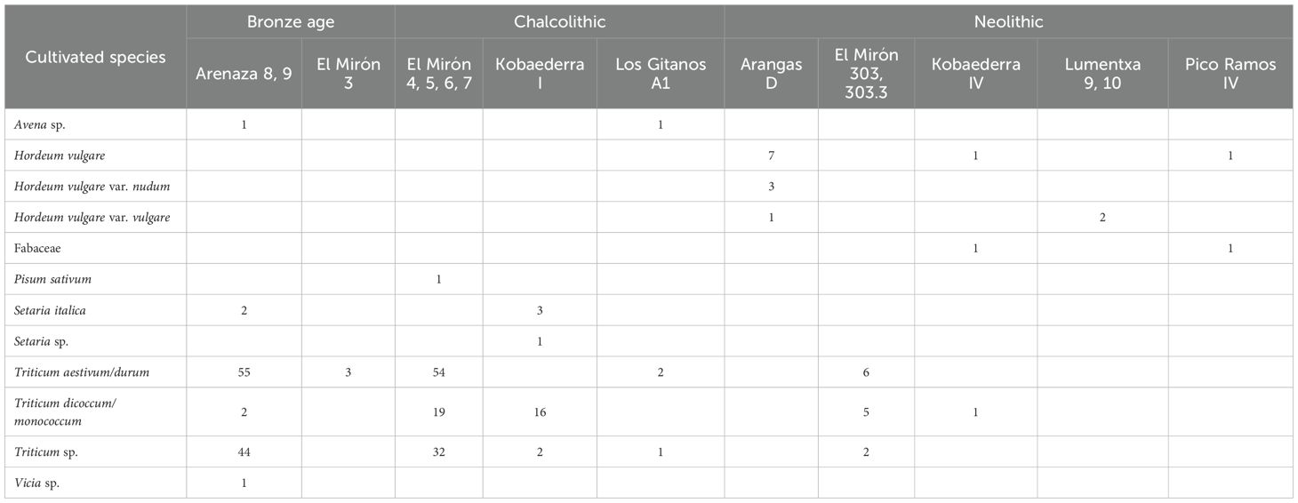 Legumes are traditionally poorly represented in archaeobotanical records due to taphonomic problems related to their processing. Although the existence of legumes in the Cantabrian archaeobotanical record is unknown until the Neolithic, some wild legumes could have been present in this region since the beginning of the Holocene. In fact, preliminary anthracological analysis of El Toral III has documented charcoals containing burnt legume remains in several stratigraphic units of the Mesolithic shell midden (Gutiérrez-Zugasti, personal communication). Later, several legumes such as lentil (L. culinaris), pea (P. sativum) broad bean (V. faba), grass and red pea (Lathyrus sativus L. and Lathyrus cicera L.), bitter betch (Vicia ervilia L. Willd.) and common vetch (Vicia sativa L.) were common in the Early Neolithic carpological record of numerous regions of Iberia (Zapata et al., 2004; Peña-Chocarro et al., 2018). In contrast, seeds of these species are absent in the Cantabrian Region, although some Fabaceae vegetal remains have been found in the Neolithic levels of El Mirón, Kobaederra, Lumentxa and Pico Ramos (Table 3). The first taxonomically legume remains are a Vicia sp. seed documented in the Arenaza Bronze Age layer 9 and a P. sativum seed discovered in El Mirón Chalcolithic level 4. Likewise, V. faba and P. sativum were widely identified in several sites of northwest Iberia during the Bronze Age (Tereso et al., 2016); therefore, it would not be surprising if these crops were also cultivated in other northern areas of the peninsula. Therefore, it is possible that some domestic legumes, such as peas, lentils, or beans, were used as food supplements by the Cantabrian communities from the Neolithic onwards.