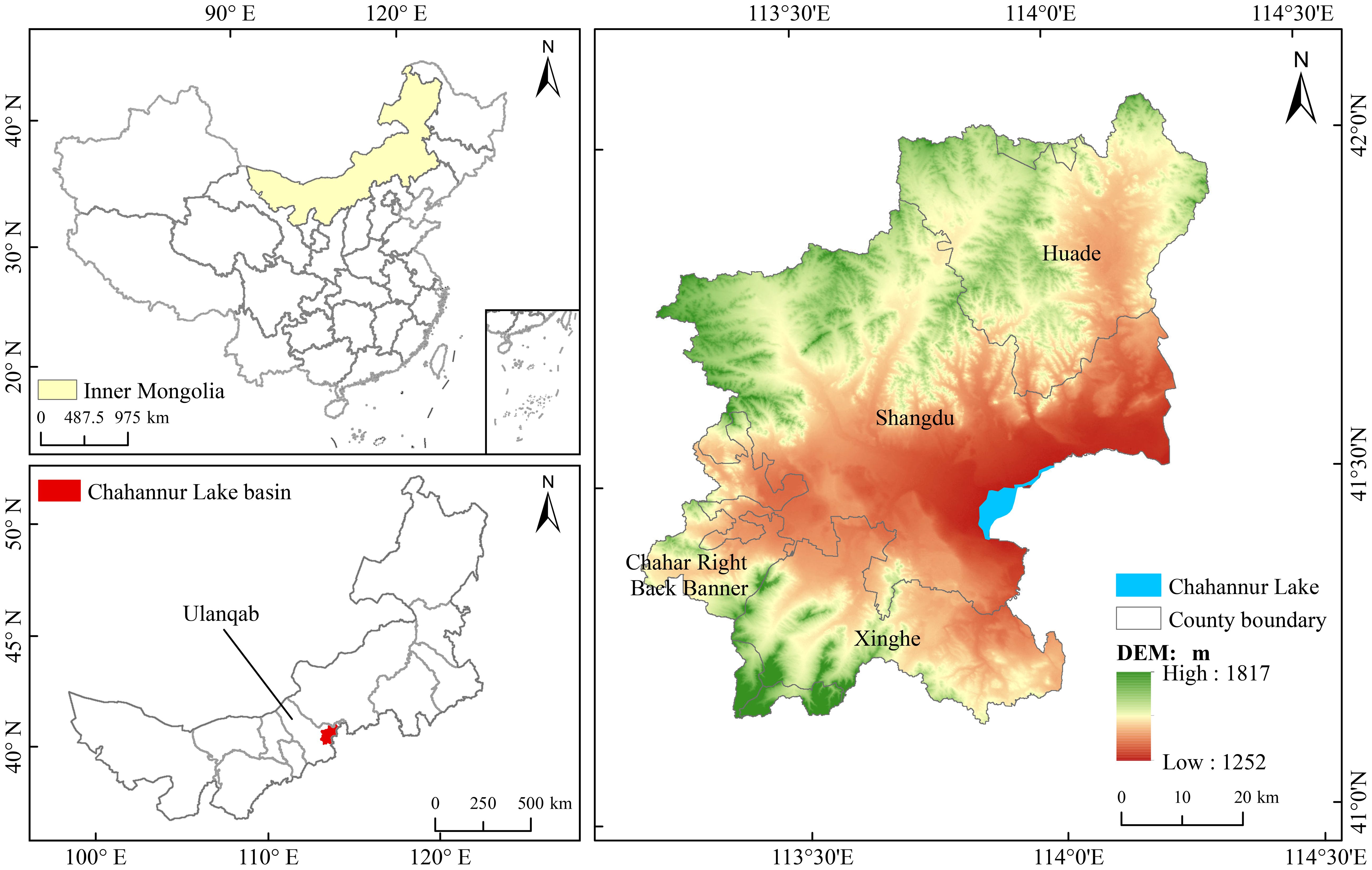 The Chahannur Lake Basin is located in the southeastern part of Inner Mongolia Autonomous Region, serving as the key area for territorial spatial ecological restoration in Inner Mongolia. The basin covers approximately 5,561 km², spanning geographical coordinates 41°14′~42°06′N and 113°18′~114°32′E (Figure 1). Landform types within the basin are predominantly low mountains and hills, intermontane basins, valley depressions and plains. The topography generally rises from the southeast toward other directions, with elevations ranging from 1,252 m to 1,817 m. The region is geographically distant from the ocean and belongs to typical temperate semi-arid continental monsoon climate, characterized by high temperature with concentrated precipitation in summer and dry, cold, windy conditions in winter. The basin has an annual mean temperature of approximately 4 °C, annual precipitation of about 351 mm, and annual mean evaporation of approximately 1,647 mm - nearly five times the precipitation amount. Due to agricultural irrigation and excessive groundwater extraction, water areas in the Chahannur Lake Basin have significantly shrunk, imposing notable pressure on the ecological environment.