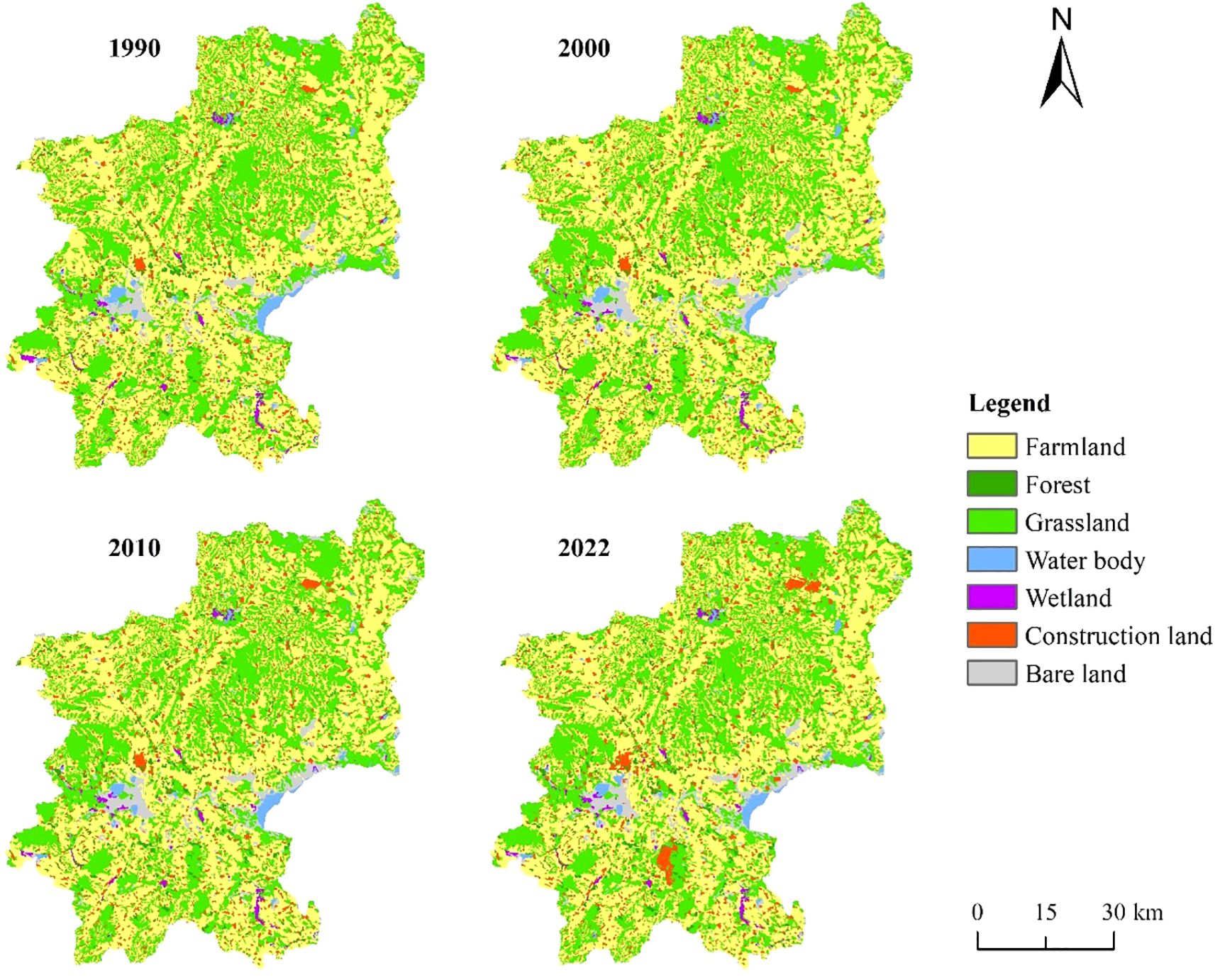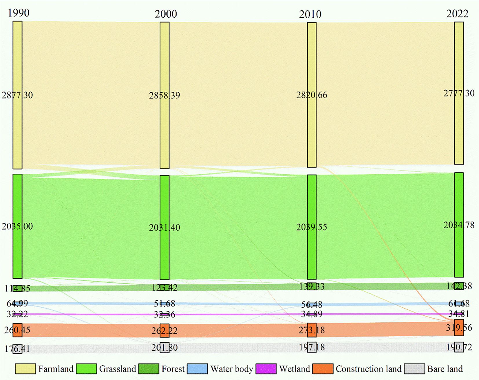 As shown in Figure 2, farmland was the dominant land use type in the Chahannur Lake Basin from 1990 to 2022, comprising over 50% of the total area, followed by grassland (>36%). These two types exhibited a spatially interlaced distribution pattern. Construction land accounted for 4.68%-5.75%, with a scattered distribution. Bare land (3.17%-3.63%) was primarily concentrated in the central region—particularly around water bodies—where saline-alkali lands were largely distributed. Forest ranged from 2.07% to 2.56%, sporadically distributed in the central-southern area. Both water body and wetland accounted for merely 1%, with minimal fluctuations. Although the overall land use structure remained stable during the study period, individual land use type showed distinct changes. Notably, farmland area decreased most significantly (100.00 km²), dropping from 51.74% in 1990 to 49.94% in 2022—a trend reflecting the effectiveness of the implementation of the “Grain for Green” Program. In contrast, forest and construction land expanded (27.53 km² and 59.11 km², respectively), while grassland area remained nearly unchanged. Wetland and bare land areas increased slightly, and water body area displayed a trend of initial decline followed by recovery.