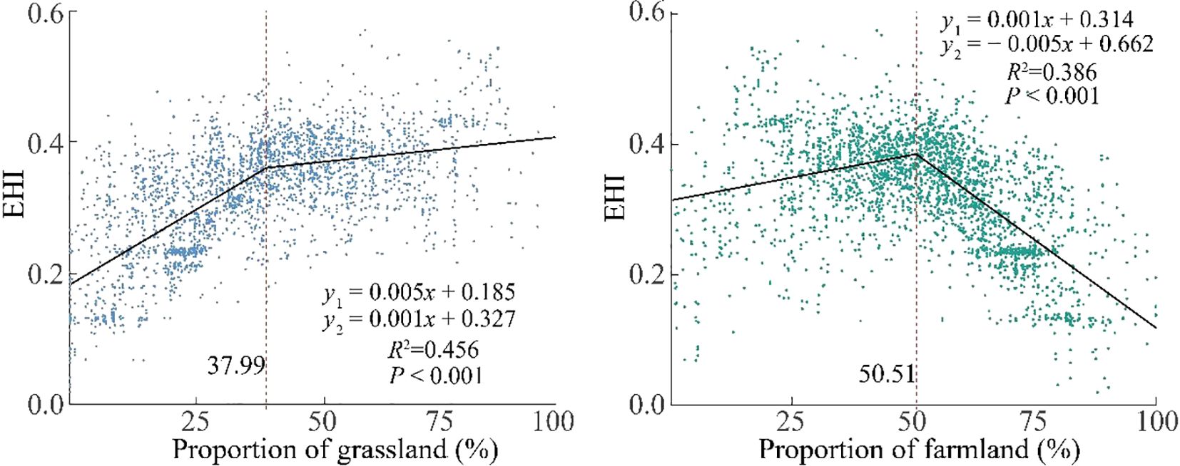 Figure 7 shows the contribution of different land use types to ecosystem health, with grassland exhibiting the highest contribution to the EHI, followed by farmland. Thus, grassland and farmland were identified as the key land use types influencing ecosystem health in the basin. Figure 8 reveals a significant non-linear relationship between the EHI and area proportions of key land use types. The grassland area proportion had a significant positive effect on ecosystem health. When the proportion was below 37.99%, an increase in grassland area led to a rapid rise in EHI, however, exceeding this threshold weakened the rate of EHI increase. The farmland area proportion also had a threshold effect on EHI. When the farmland area proportion was below 50.51%, expanding farmland positively influenced EHI, conversely, exceeding this threshold resulted in a negative impact of farmland expansion on EHI.