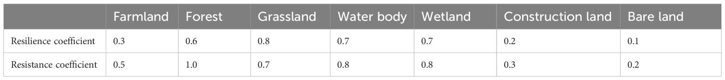 where Resil and Resist denote ecological resilience and resistance, respectively; Ai is the area of land use type i; n represents the number of land use types; and Cr,i and Ct,i are resilience coefficient and resistance coefficient for land use type i, respectively.