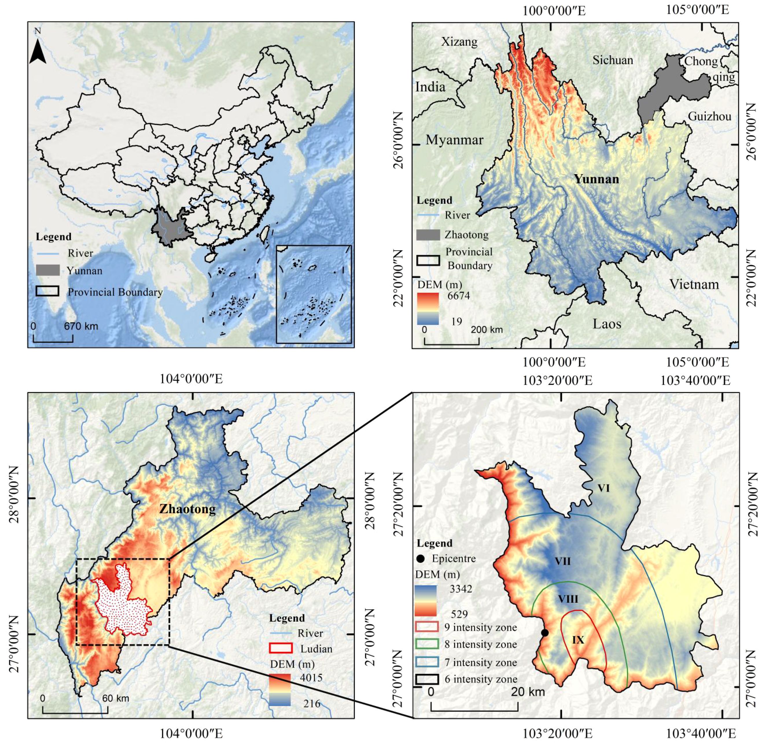 Seismic Intensity: Data sourced from the Yunnan Earthquake Agency (https://www.yndzj.gov.cn) divided the area into four intensity levels: VI, VII, VIII, and IX.