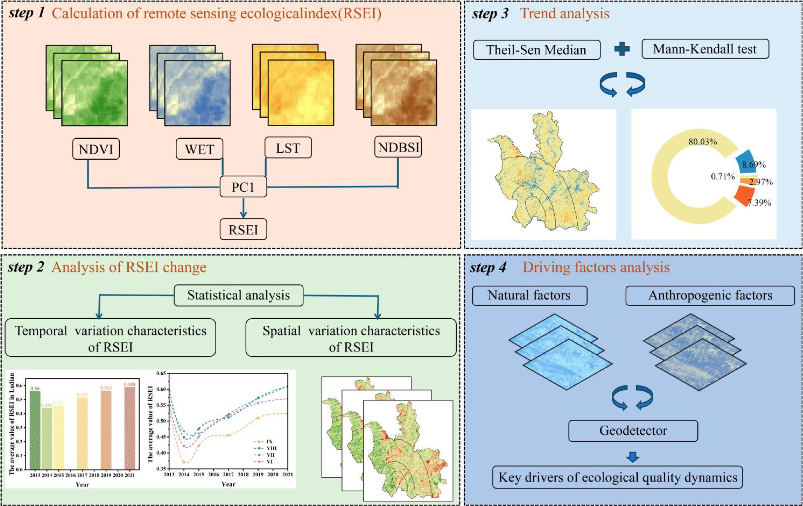 Current research on the assessment of ecological environment quality under earthquake disturbances focuses primarily on two aspects: identification of changes in ecological quality and their driving factors in affected regions. Regarding changes in ecological quality, existing studies employ methods such as field surveys and monitoring, ecological models, and remote sensing technologies. Among these, field surveys and monitoring, through on-site sampling and analysis of soil, water quality, vegetation, and other aspects in disaster areas, can obtain real and reliable ecological environment quality monitoring data (Hirayama et al., 2020; Hamada et al., 2024). providing a reliable basis for ecological environment quality assessment. However, due to limitations in sampling costs, human resources, and natural conditions, this method has certain limitations in the spatial and temporal continuity of data coverage (Yin et al., 2025). Nevertheless, the obtained in-situ data remains an important validation benchmark for other methods. Ecological modeling methods, such as ecosystem process models (Duan et al., 2021; Cattani et al., 2023), landscape ecological models (Luo et al., 2023; Tian et al., 2023), and eco-hydrological models (Jakovljevic and Lozanov-Crvenkovic, 2015; Chen et al., 2021), can provide large-scale and long-term simulations of the dynamic changes in ecological environment quality from a macro perspective, offering an important tool for understanding the long-term evolution of ecosystems post-earthquake. However, to construct operable ecological models, it is usually necessary to simplify and make assumptions about complex ecosystems, which may lead to discrepancies between the modeled ecological changes and the actual situation. Despite this, the method still holds unique advantages in revealing the mechanisms of post-earthquake ecological evolution and predicting long-term trends. In recent years, with the rapid development of earth observation technologies, remote sensing monitoring, with its advantages of high precision, efficiency, and large-scale coverage (Yuan et al., 2021), has become an important means of obtaining long-term, high-precision ecological environment data, and is widely used in ecological environment quality monitoring and evaluation. Relevant studies, based on multi-temporal remote sensing image data, have quantified the ecological environment’s disturbance and recovery from earthquakes through the construction of indices such as normalized vegetation Index (Pandey et al., 2022), vegetation coverage (Nakata et al., 2023), and net primary productivity (Duan et al., 2024). However, single indices fail to capture the complexity and multidimensionality of ecosystems (Li et al., 2025). To address these limitations, integrated ecological evaluation indices have emerged (Xu, 2013). proposed the Remote Sensing Ecological Index (RSEI), which synthesizes four indicators—greenness, wetness, dryness, and heat—using principal component analysis. This composite index overcomes the constraints of single-index approaches by providing a more comprehensive, cross-temporal, and cross-spatial assessment of ecological quality. It enables rapid, accurate, and objective assessment of ecological environment quality in disaster-affected areas (Xu et al., 2019), effectively addressing the shortcomings of the aforementioned methods. Consequently, the RSEI has become an essential tool for dynamic monitoring of ecological environment quality.