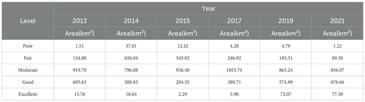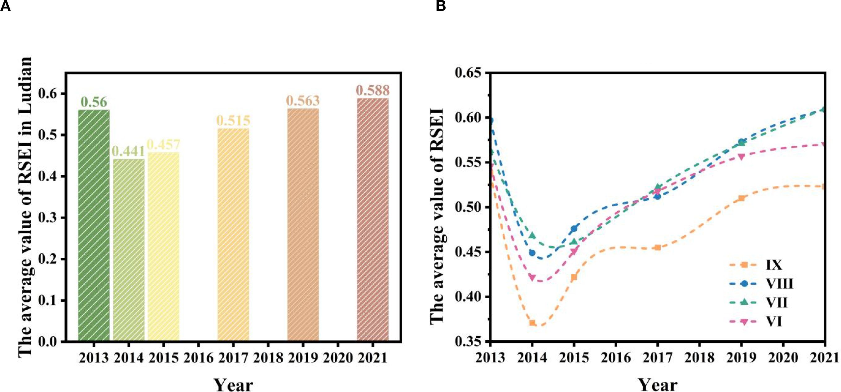 Based on existing research (Du et al., 2025), the RSEI was normalized to the range [0, 1], and the equal interval method was used to classify the ecological environmental quality of the Ludian area from 2013 to 2021 into five grades: poor (RSEI value 0–0.2), fair (0.2–0.4), moderate (0.4–0.6), good (0.6–0.8), and excellent (0.8–1.0).