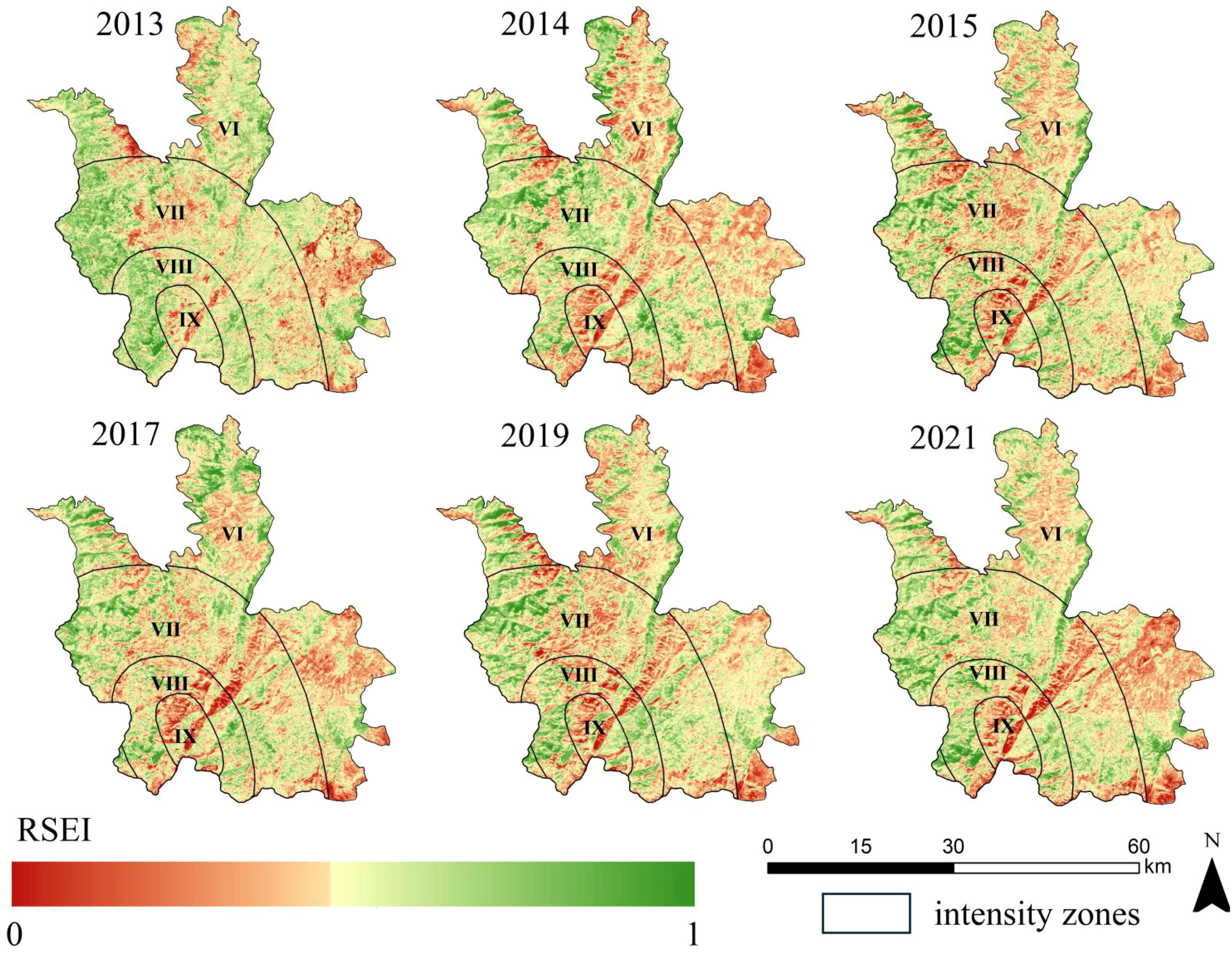 1. The destructive effects of the earthquake exhibited a pronounced intensity-gradient feature. The Ludian earthquake caused a short-term decline of 21.3% in the mean RSEI, with the severity of degradation strongly correlated with seismic intensity. The high-intensity zone (IX degree) showed the largest decrease (31.0%), followed by the medium-intensity zone (24.8%), while the low-intensity zone experienced the smallest decline (16.9%).
