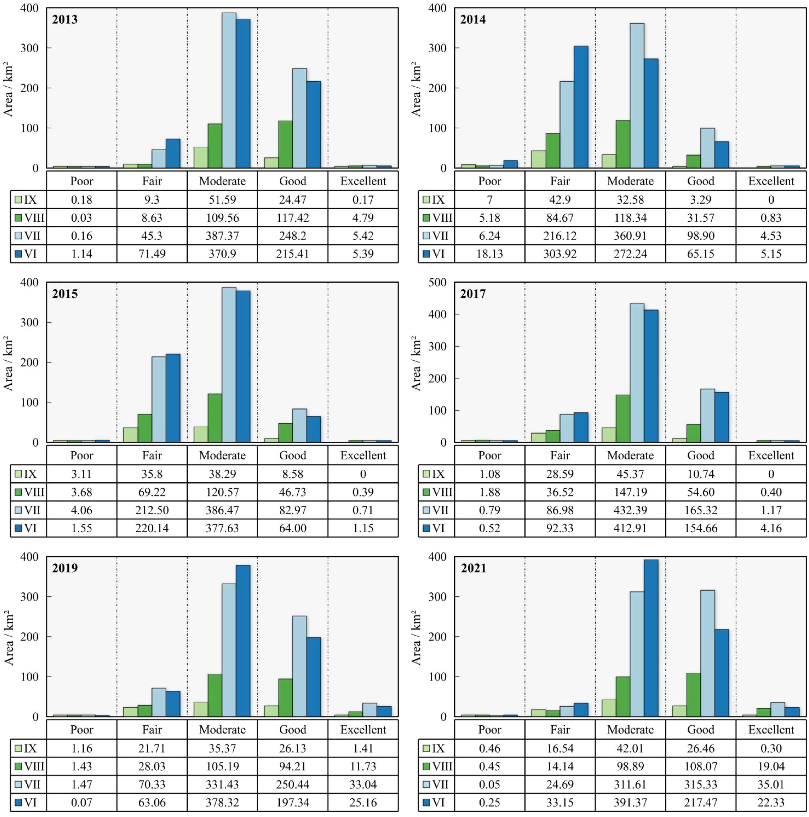 During the recovery period, ecological quality gradually improved. Poor quality areas steadily decreased, with the IX zone reducing to 0.46 km² by 2021 and the VI zone decreasing from 1.14 km² to 0.25 km². At the same time, areas of good and excellent quality increased significantly. In the VII zone, the good quality area grew from 82.97 km² in 2015 to 315.33 km² in 2021, while in the VIII zone, the excellent quality area expanded from 0.83 km² to 19.04 km². The recovery rates varied significantly across intensity zones. Low-intensity zones (e.g., VI zone) recovered faster, with a steady increase in the proportion of excellent quality areas, whereas high-intensity zones (e.g., IX zone) experienced slower recovery, requiring a longer restoration period.