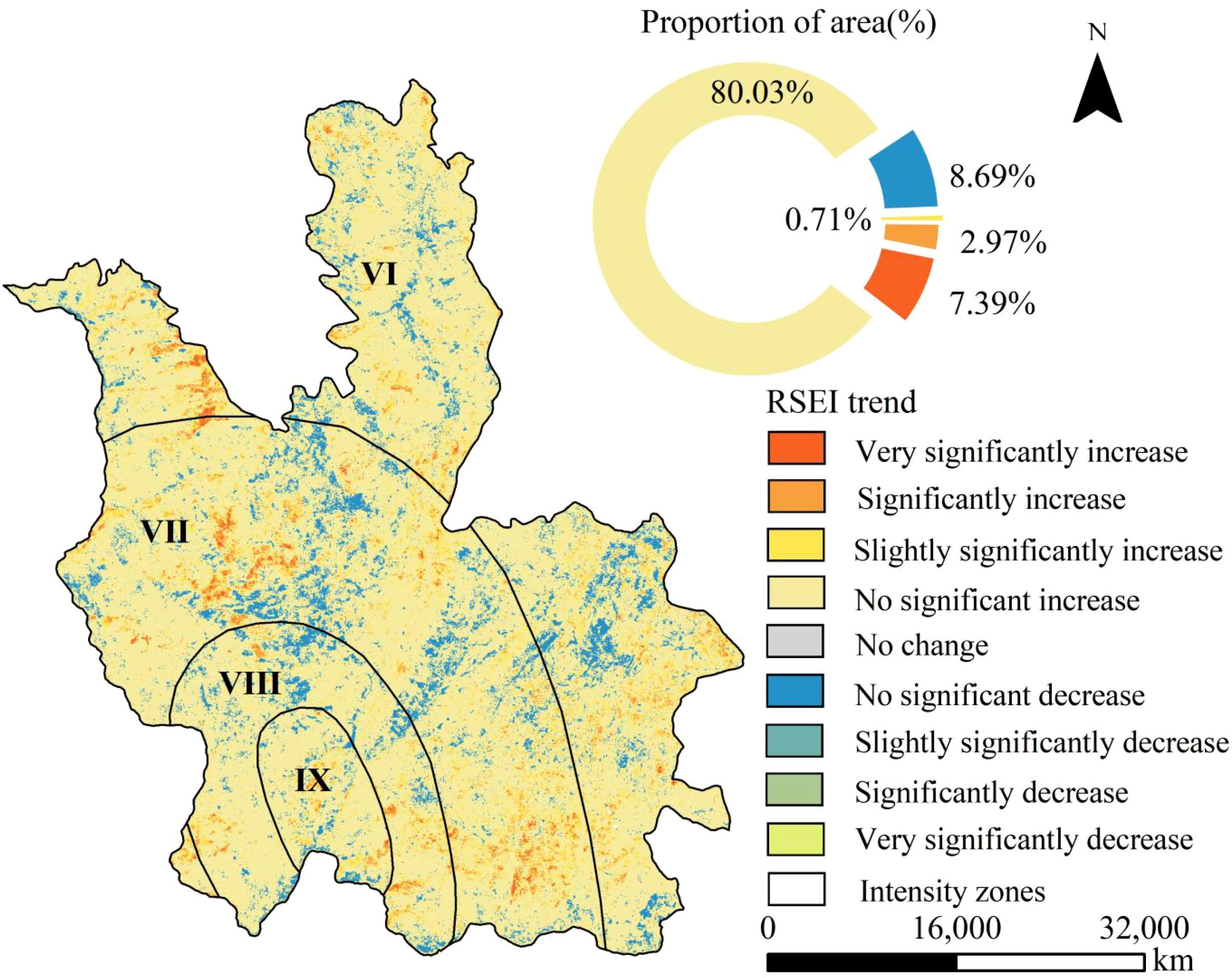 From the perspective of spatial distribution, trend analysis results showed that ecological environment quality improved in 91% of the study area, while 8.75% of degraded zones were concentrated in the southeastern part of the Intensity VI zone, the southern part of the Intensity VII zone, and the northern part of the Intensity VIII zone. This pattern was likely closely related to disturbances of the natural recovery process caused by human activities such as agricultural expansion.