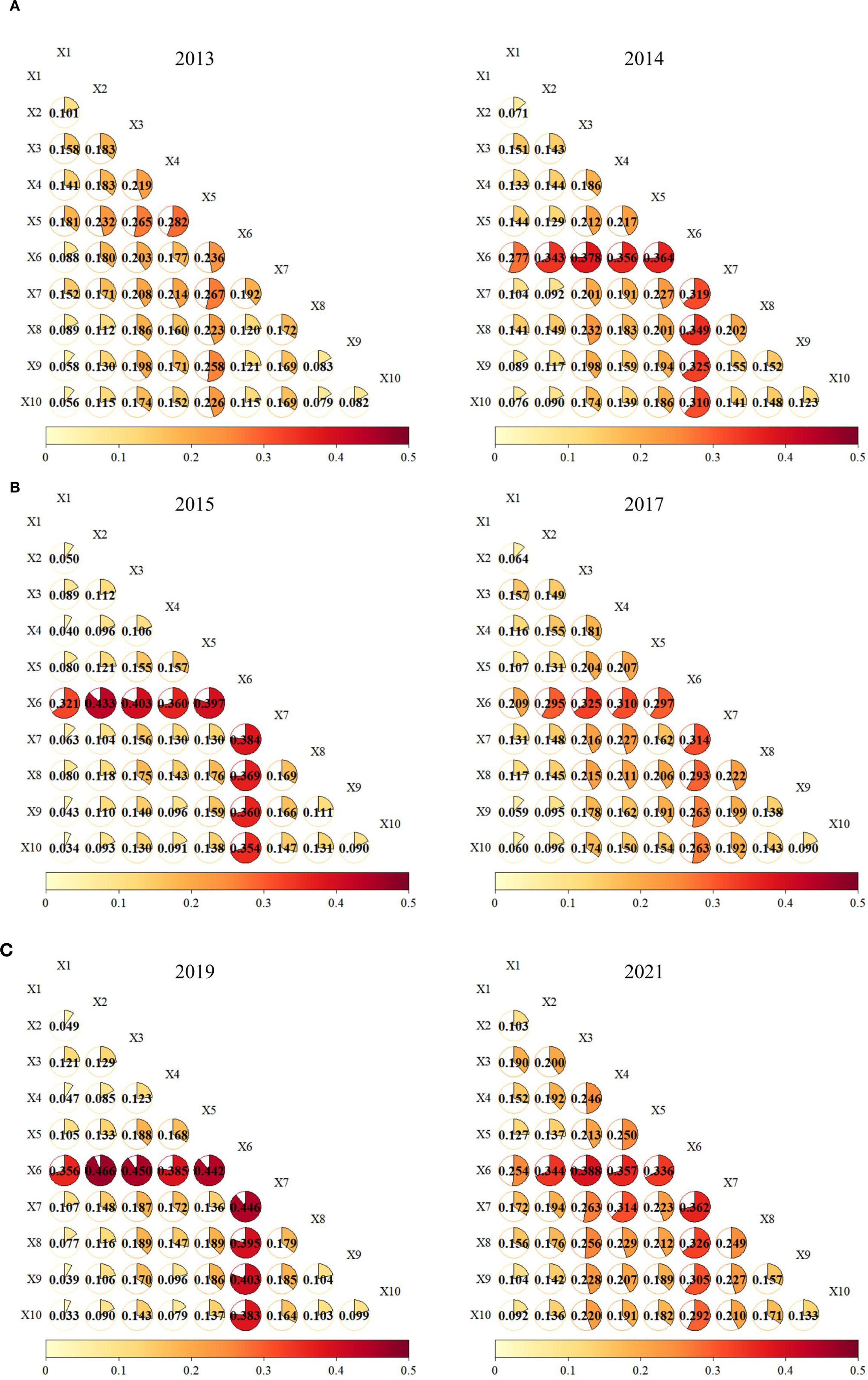 The interaction detector was employed to explore the interactive relationships between different influencing factors and the spatial differentiation of RSEI. The results (Figures 7A–C) showed that the interactions among all ten factors exhibited a nonlinear enhancement pattern, indicating that the spatial differentiation of ecological environment quality in Ludian was the outcome of a coupled and reinforced effect of multiple factors.