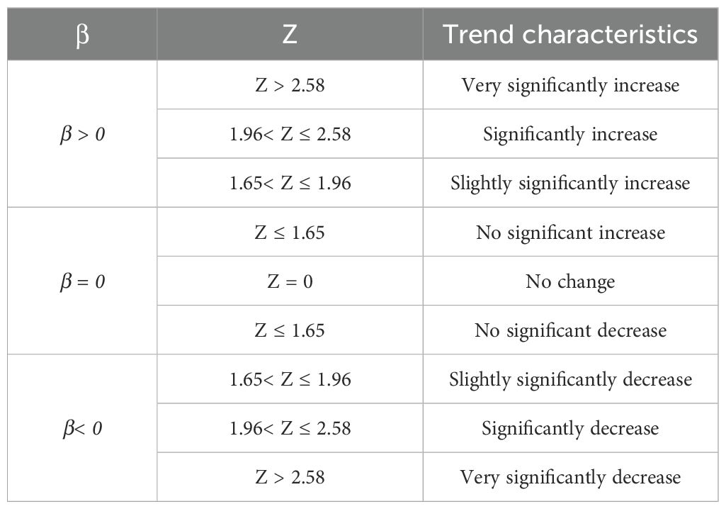The Mann-Kendall method is used to test the significance of the trends, with the trend characteristics summarized in the Table 1.