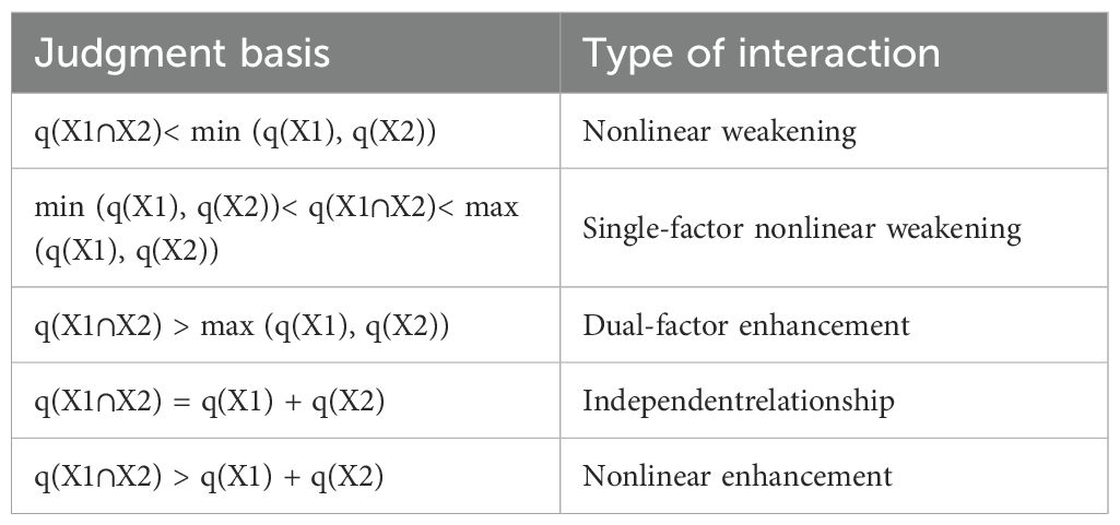 Interaction Detection: Evaluates the explanatory power of two distinct driving factors acting simultaneously on an object regarding its spatial heterogeneity. The types of interactions are categorized as follows (Table 2).