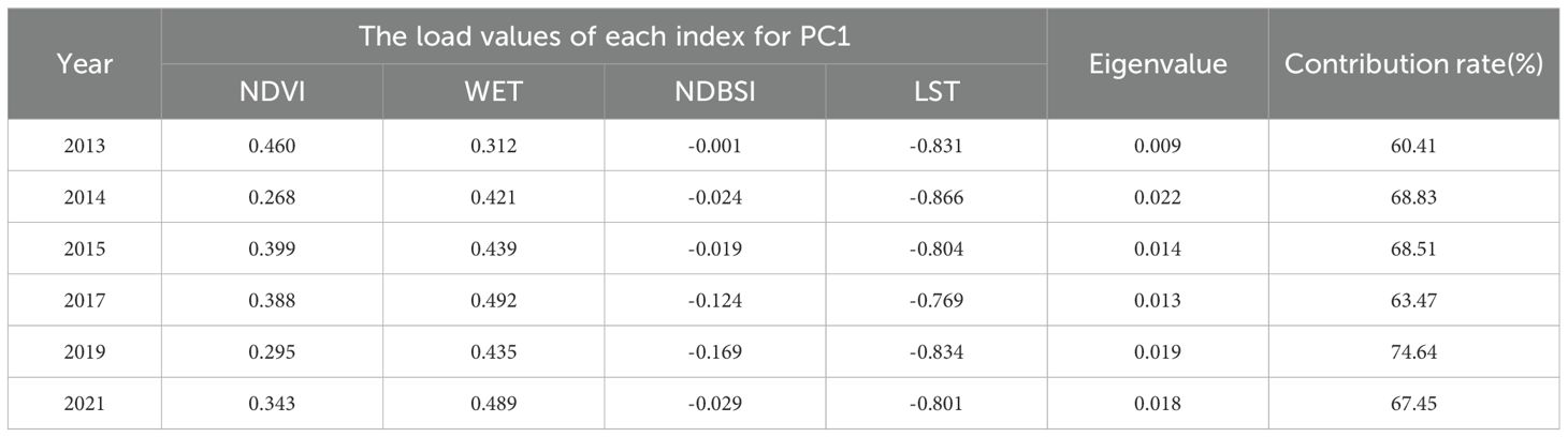 The loadings for NDVI and WET were consistently positive on PC1, indicating their positive influence on ecological quality. Conversely, the loadings of NDBSI and LST were negative, highlighting their adverse effects. These findings validate the applicability and reliability of the RSEI model in the study area.