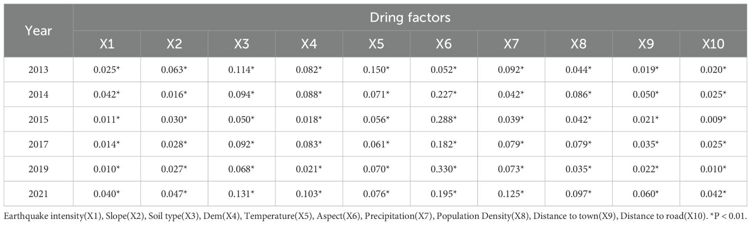 The factor detection results (Table 5) showed that all variables were statistically significant at the 1% level (p< 0.01), indicating that each factor had a significant impact on the spatial differentiation of ecological quality recovery in Ludian, though with varying degrees of influence.