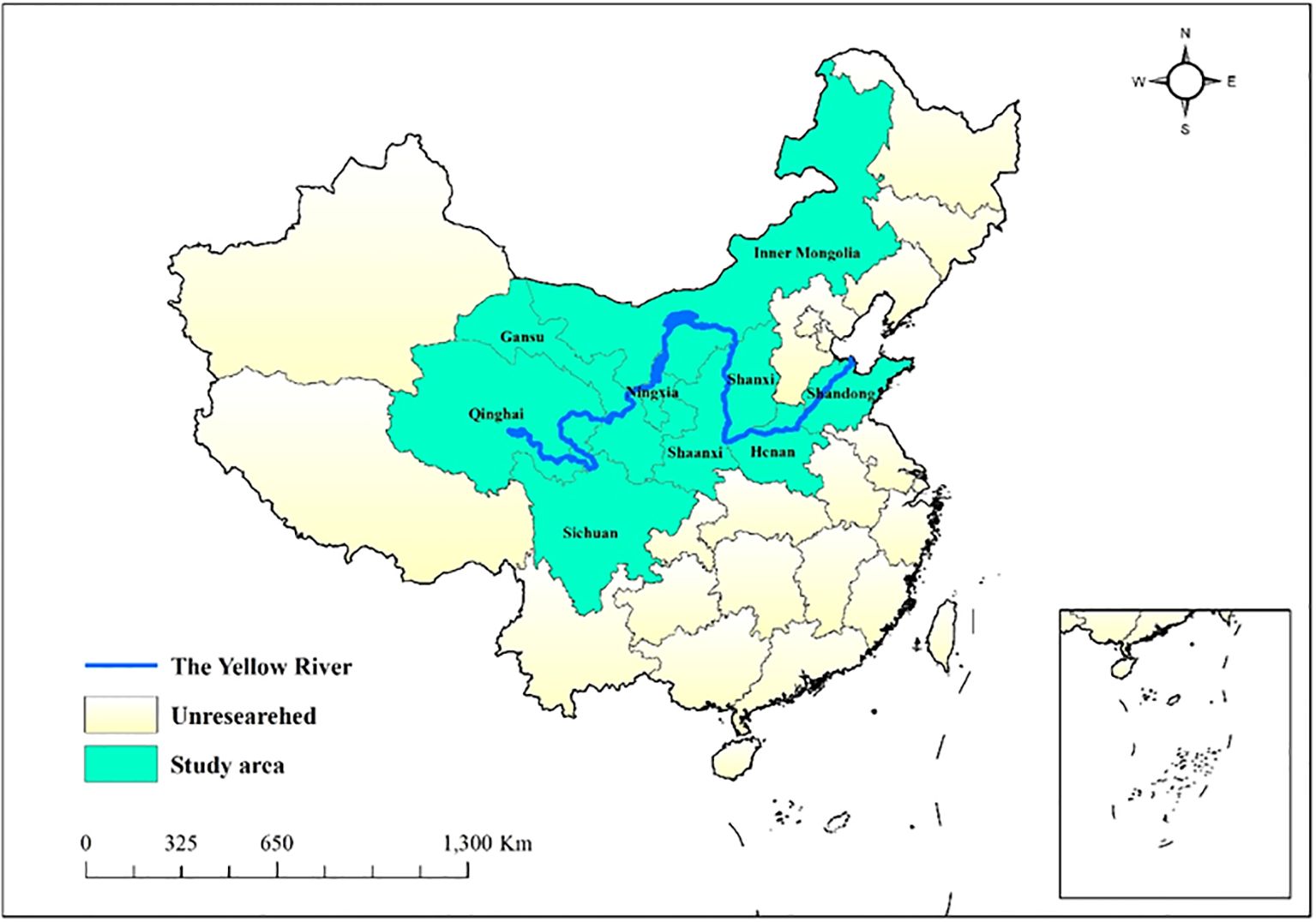 Despite the fact that the grey prediction model has demonstrated much promise for use with respect to forecasting carbon emissions, it still faces some problems. Firstly, traditional models such as GM(1,1) often have limited prediction accuracy when dealing with data with significant nonlinear and non-homogeneous characteristics. Secondly, in the context of complex datasets involving multiple variables, existing models often struggle to account for the intricate dependencies among these variables, thereby undermining the predictive performance and overall accuracy of the results. In addition, the limitations of the model in parameter optimization also limit its ability to adapt to complex and dynamic data environments. In order to address these limitations and improve prediction performance, the present study employs the UNGM(1,1). This model aims to achieve more accurate predictions of nonlinear, non-homogeneous, and multivariate data by optimizing algorithms and considering new mechanisms for variable interactions. Scientific studies on carbon emissions in the Yellow River Basin can give policymakers a strong foundation for decision-making by employing the UNGM(1,1) model. Figure 1 shows the research area of this paper.
