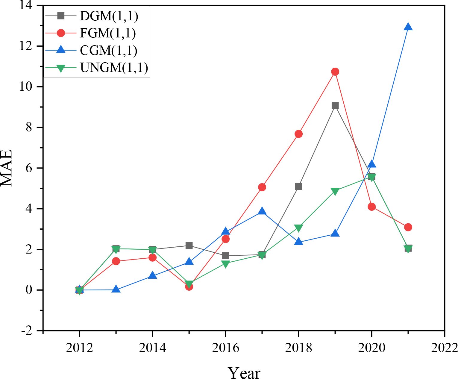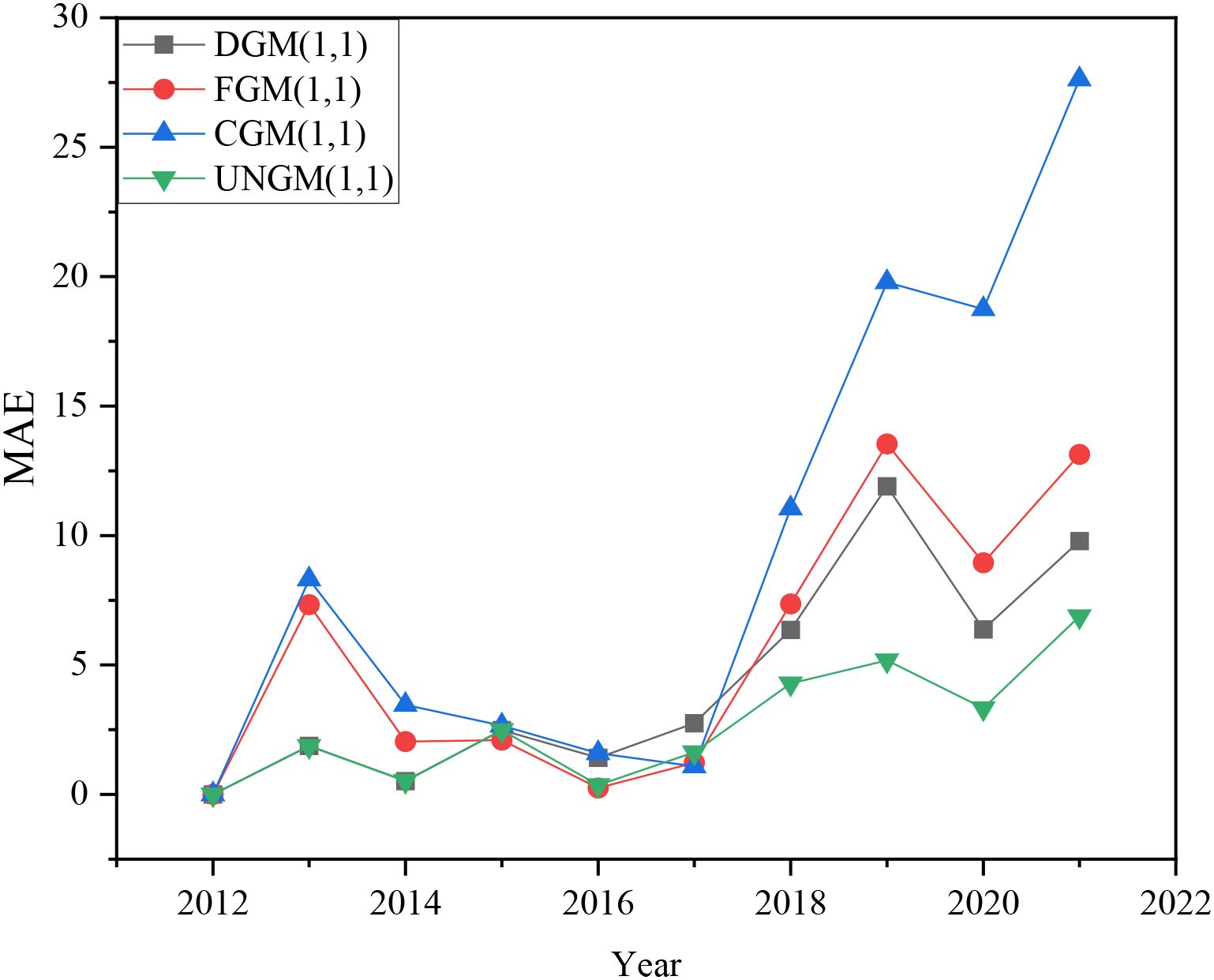 Compared with existing research, the contribution of this study mainly lies in the following aspects: firstly, in terms of methodology, the UNGM (1,1) model reconstructs the background value by introducing the integral mean value theorem, overcoming the bias problem of traditional grey models in parameter estimation and background value calculation, and significantly improving the prediction accuracy. Compared with models such as DGM (1,1), FGM (1,1), and CGM (1,1), UNGM (1,1) exhibits lower MAPE and more stable MAE curves in both fitting and prediction stages (Figures 2, 3), especially when dealing with nonlinear and non-homogeneous data. UNGM (1,1) exhibits stronger applicability and robustness in regional level carbon emission prediction.
