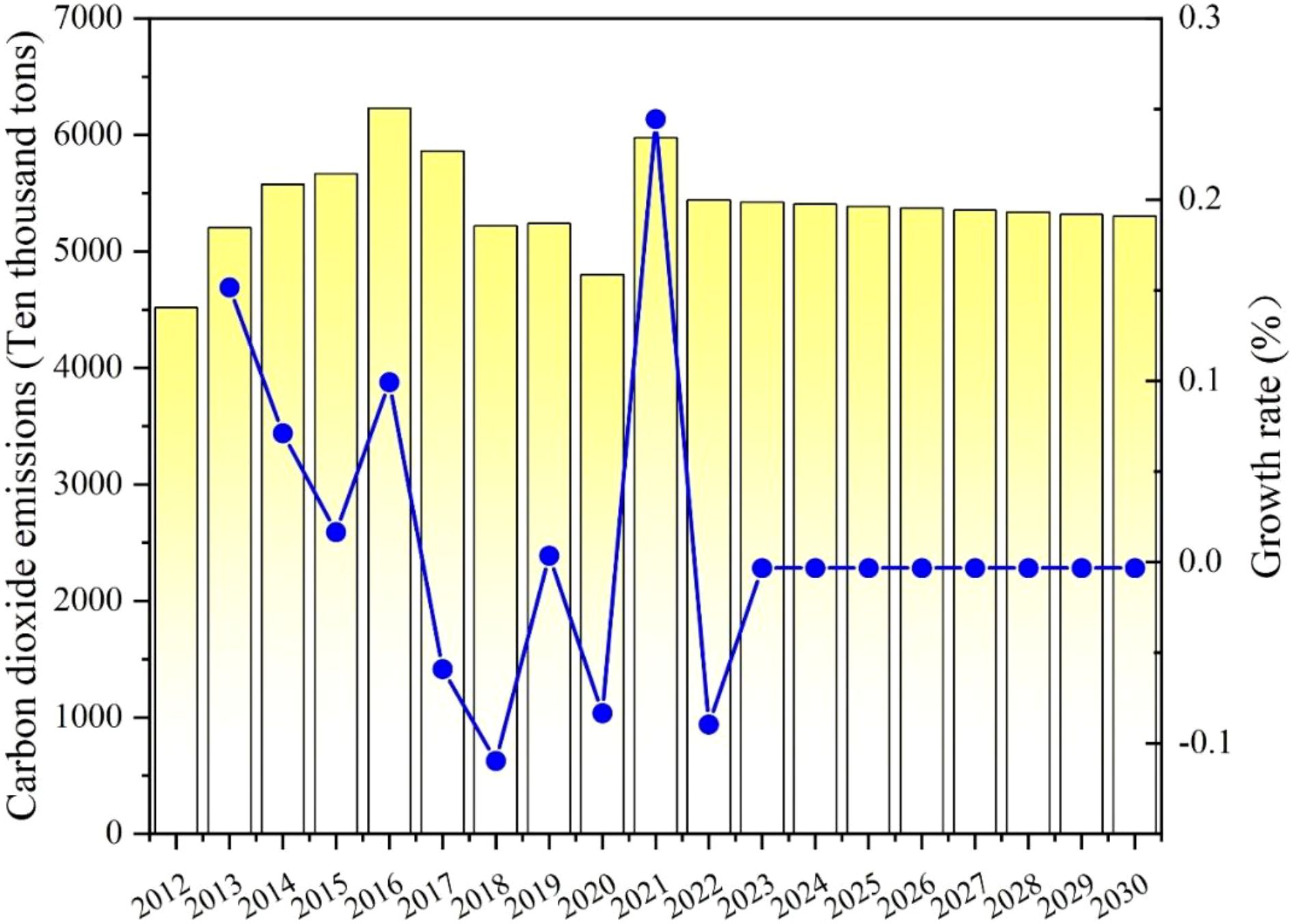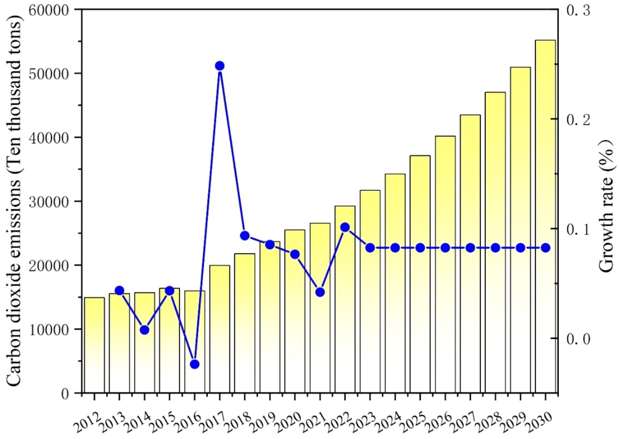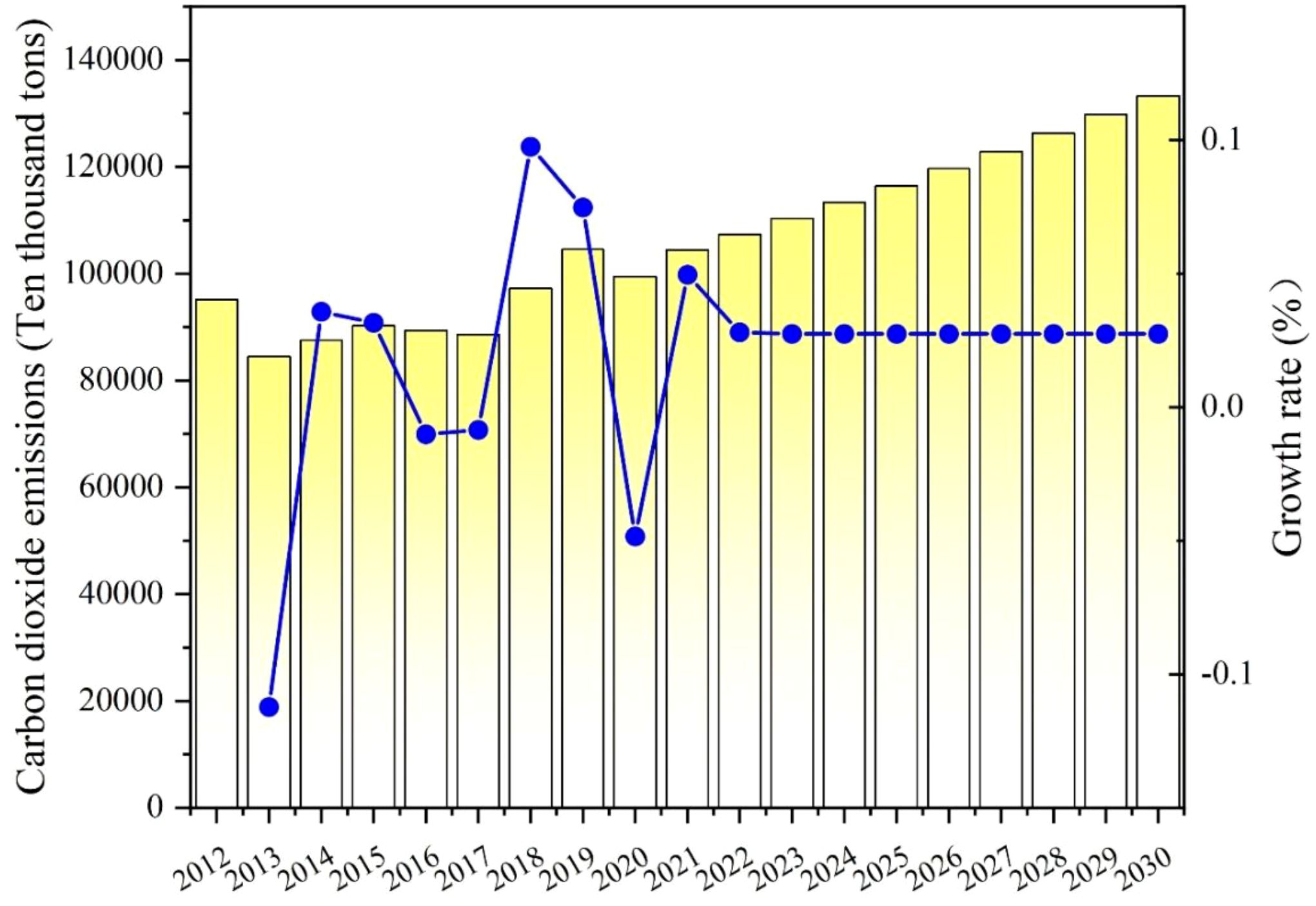 As shown in Table 5 and Figure 6, the overall emissions of carbon dioxide in Gansu Province exhibited a fluctuating rise from 2012 to 2021. After 2014, carbon emissions decreased slightly but rose again in 2018, followed by a significant increase in 2021, reaching 184.128 million tons with a growth rate of 8.95%. The significant increase may be attributed to the gradual control of the global pandemic in 2021. In an effort to stimulate economic recovery, the government may have increased infrastructure investment, while high energy-consuming projects may be postponed during the pandemic, leading to a concentrated release of production capacity in 2021 and a surge in emissions. Consequently, Gansu Province’s carbon dioxide emissions also rise. Forecast data indicates that carbon dioxide emissions are expected to increase year by year, reaching 1998.653 million tons by 2030, indicating significant pressure to reduce emissions. Although the growth rate is slow and steady, the sustained increase in emissions means that achieving the carbon peak target by 2030 will be challenging. As an underdeveloped region, economic growth remains the top priority in Gansu Province, which may conflict with emission reduction targets. In order to improve people’s living standards and promote regional development, Gansu Province needs to continue promoting industrialization and urbanization processes, which are frequently accompanied by significant emissions of carbon dioxide and energy. It is difficult to completely break free from dependence on fossil fuels like coal in the short term. In the future, Gansu Province should strictly implement emission reduction goals and environmental protection measures to ensure the sustainable growth and green transformation of high-energy-consuming industries. It is necessary to further promote technological innovation, increase the share of renewable energy sources such as solar and wind power, reduce dependence on coal, and make concerted efforts to achieve carbon peaking targets.