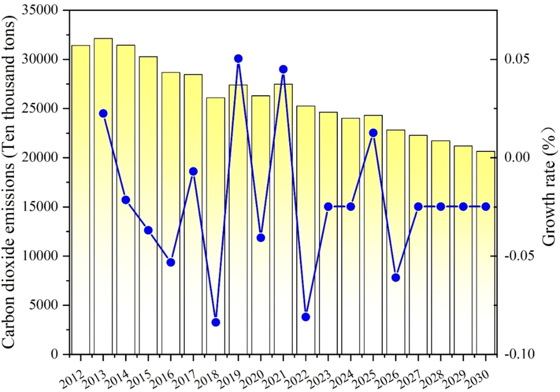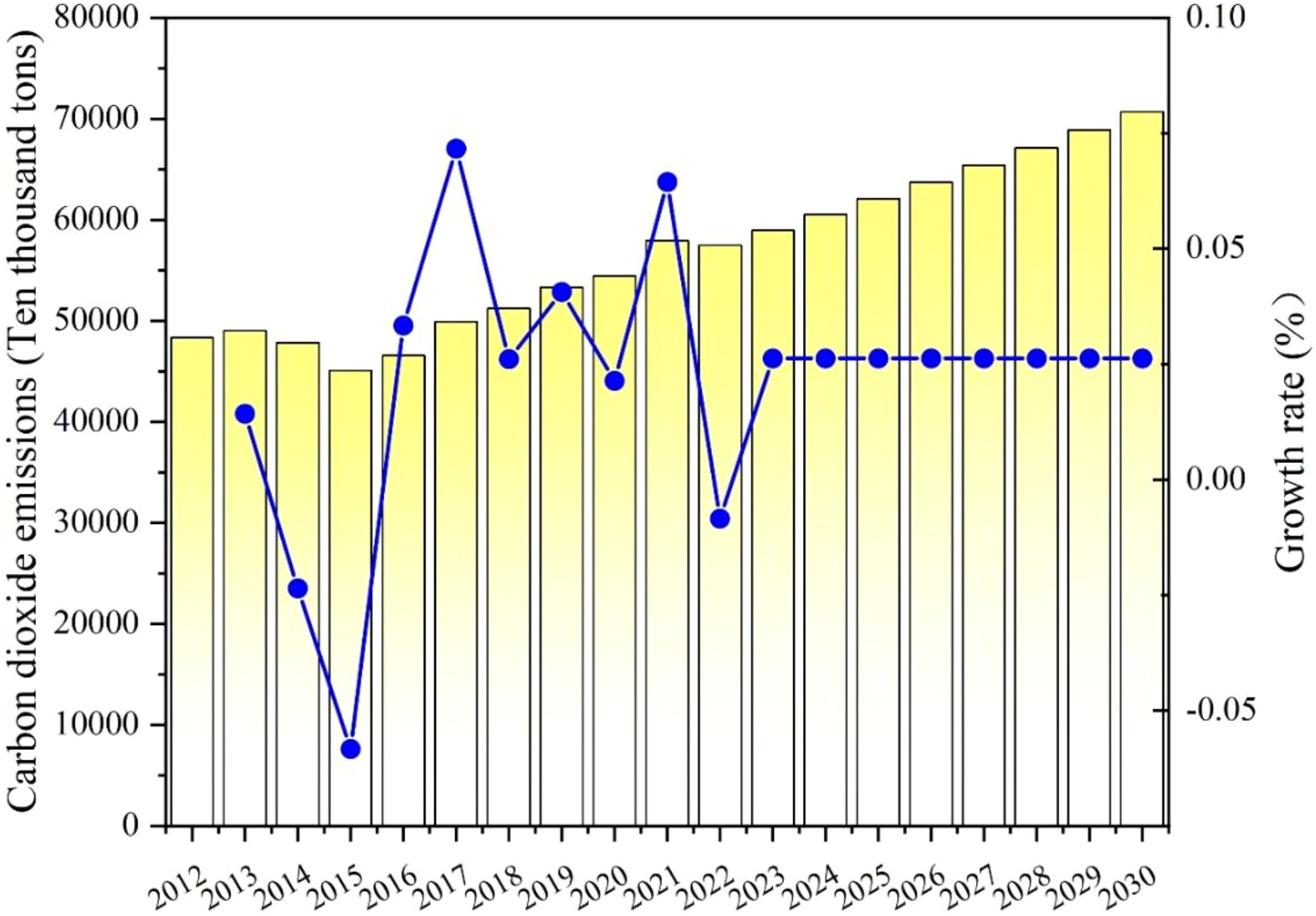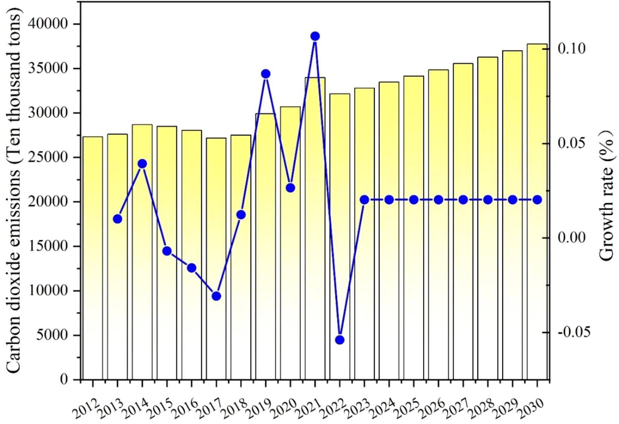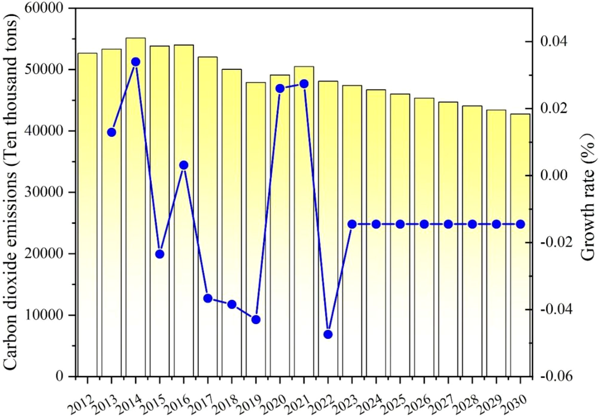 According to Table 9 and Figure 10, the overall carbon dioxide emissions in Shaanxi Province exhibited a fluctuating trend between 2012 and 2021. Emissions increased prior to 2014, followed by a marked decline. However, emissions have risen again since 2017 and reached a peak of 339842500 tons in 2021, with a growth rate of 6.44%. This growth may be related to economic recovery, industrial production recovery, and increased energy demand. The predicted data shows that the emissions of carbon dioxide in Shaanxi are expected to increase year by year from 2022. Although the growth rate may gradually stabilize, emissions are projected to reach 377.57603 tons by 2030. These projections indicate that Shaanxi faces significant challenges in achieving its 2030 carbon peak target. The reason is that significant carbon emissions coincide with economic expansion, and Shaanxi still promotes economic growth through high carbon emissions. Shaanxi is one of the largest energy-consuming provinces in China, characterized by a concentration of traditional industries with high energy demand and significant carbon emissions, such as coal and chemical industries. During the period of economic recovery, the growth of industrial production and the rise in energy demand further contributed to the increase in carbon emissions. Resulting in neglecting environmental protection and goals for reducing emissions. In the future, Shaanxi should utilize its own advantages to develop renewable energy, improve technology in high energy-consuming industries, and reduce energy consumption per unit product. At the same time, Shaanxi should implement a green ecological strategy to boost the tertiary industry’s development and service economy.