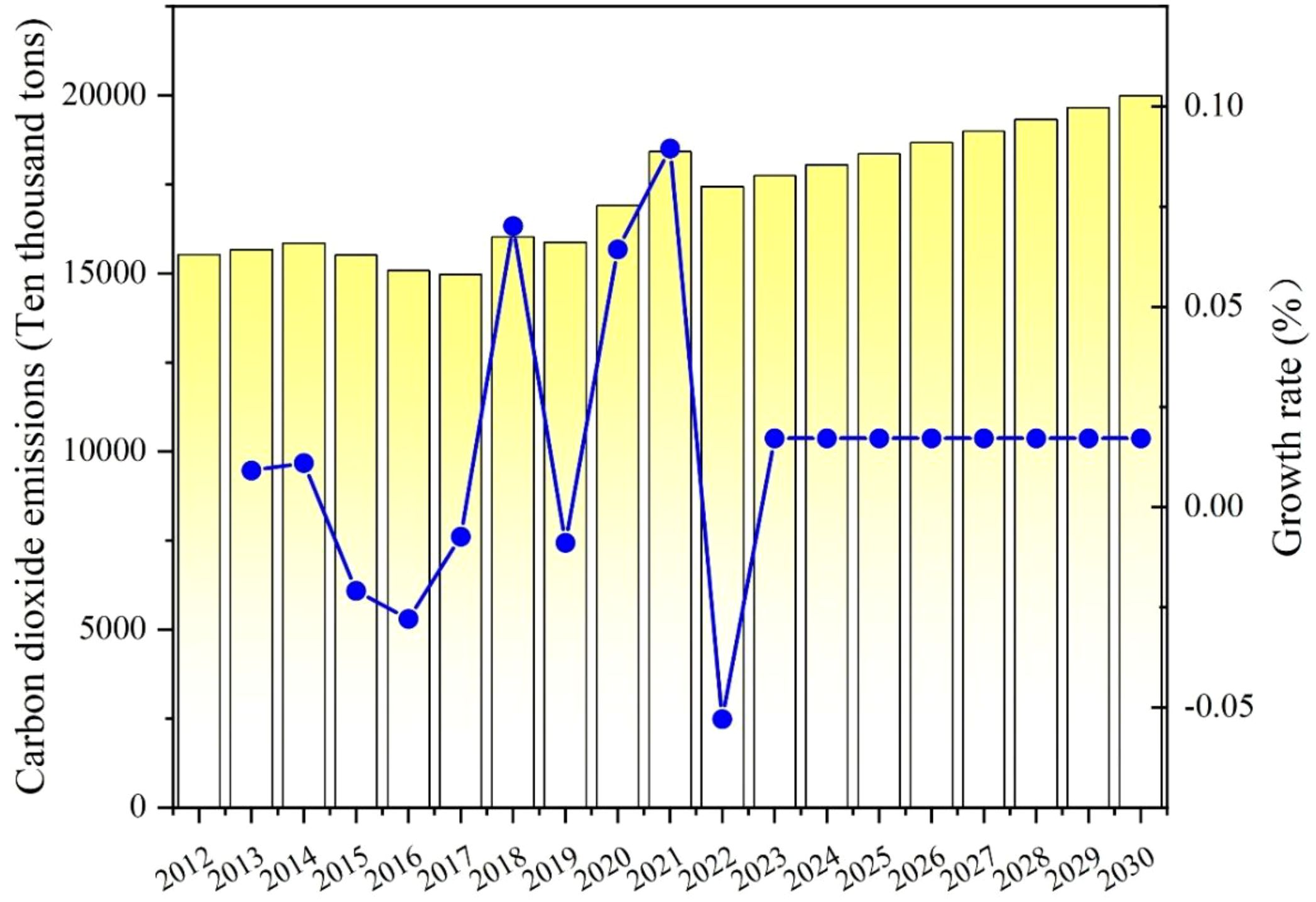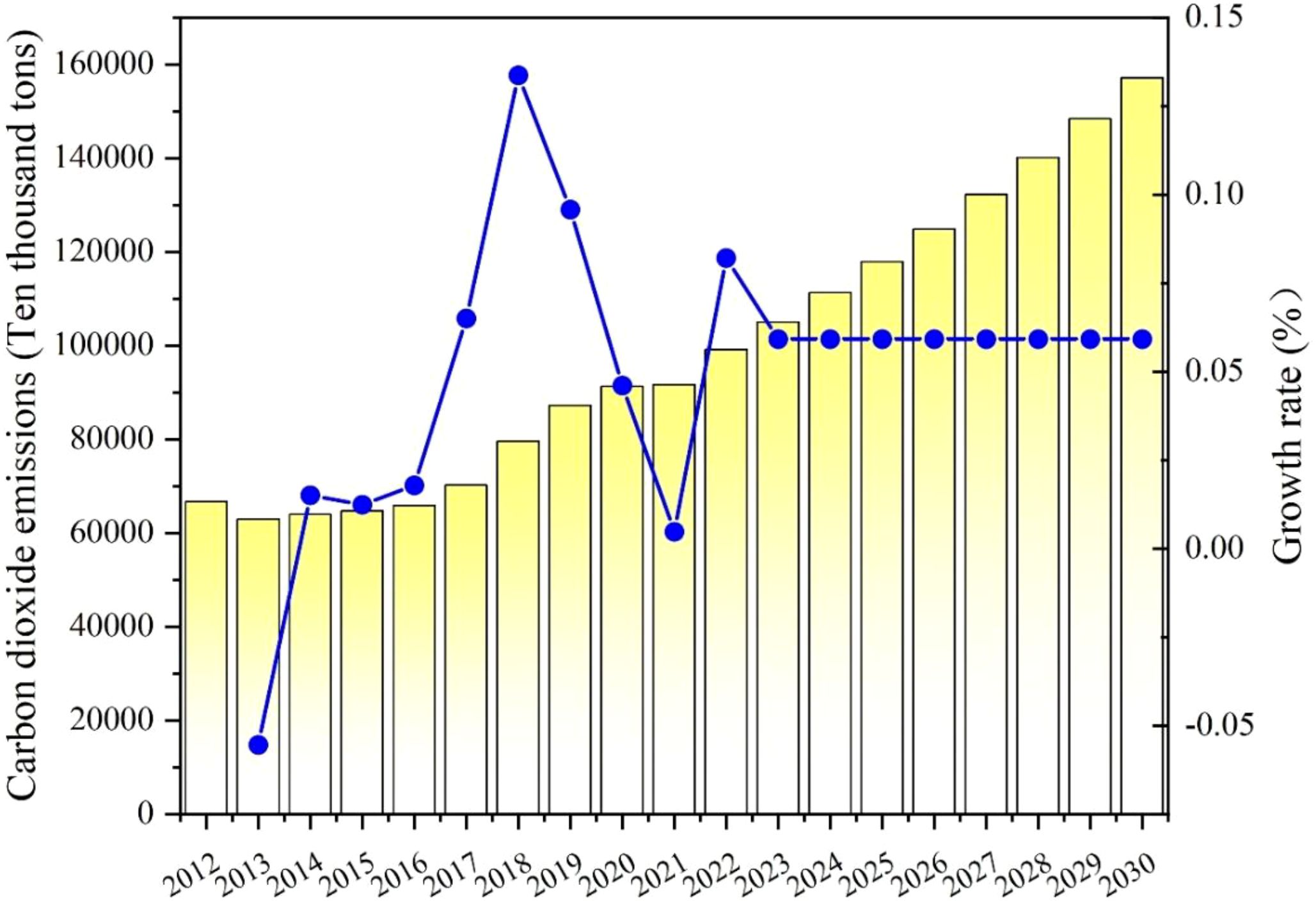 According to Table 7 and Figure 8, the total amount of carbon dioxide emissions in Inner Mongolia increased between 2012 and 2021. After 2012, the rate of increase in emissions initially increased, and then in 2018, the growth rate decreased. According to forecast data, the emissions of carbon dioxide in Inner Mongolia are anticipated to increase year by year from 2022. It is expected that by 2030, the overall carbon dioxide emissions will reach approximately 1571.5033 million tons. Although the growth rate has declined and stabilized after 2022, overall emissions of carbon are expected to continue to increase due to the large base. Even if the growth rate remains at a low or steady level, achieving the goal of peaking carbon emissions still faces significant challenges as long as positive growth is maintained. As a major energy province, Inner Mongolia’s carbon emissions have been consistently high, and the lack of cooperation between economic growth and the environment is particularly prominent. The development of heavy industry and energy-intensive industries has caused carbon dioxide emissions to rise. Coal dominates energy consumption in Inner Mongolia. Carbon dioxide emissions in Inner Mongolia will keep rising if the industrial structure and coal’s energy market share are not changed. Consequently, for Inner Mongolia to attain a carbon peak before 2030, it must reform its industrial structure and actively advance sustainable energy to supplant coal use.