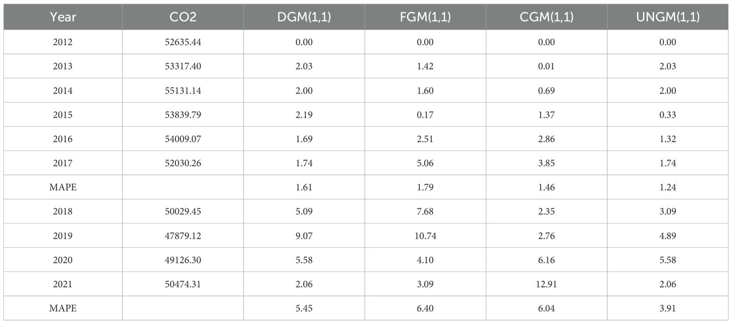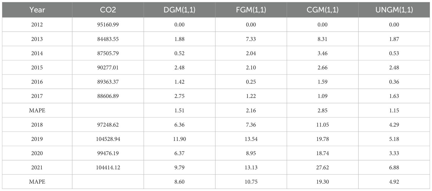 The grey system theory has unique advantages for processing the non-linearity and limited sample size of the carbon emissions data from the Yellow River Basin. The grey prediction model is part of the grey system theory, which is mainly used to handle prediction problems involving small samples, as well as incomplete and uncertain data. Grey prediction models have been used extensively since Deng’s 1982 proposal of the grey system theory in domains including economy, environment, and energy (Deng, 1982). In the field of economics, Zhang et al. proposed a novel multivariate grey prediction model that incorporates spatial proximity effects to study the future economic output of Jiangsu Province, China, from 2021 to 2025 (Zhang et al., 2023). Chen et al. proposed an improved grey wave prediction method to predict the monthly nickel and aluminum prices. Through comparison of the results, the enhanced grey wave prediction technique was discovered to be more accurate (Chen et al., 2016). In terms of the environment, Zhou et al. proposed an enhanced seasonal grey model for forecasting air quality in China’s Yangtze River Delta area by combining seasonal elements with the NGBM (1,1) model (Zhou et al., 2020). Shaheen et al. used the traditional GM(1,1) model to predict the indicators of environmental degradation in Pakistan (Shaheen et al., 2025). Wang et al. predicted the annual ecological water consumption of 30 provinces in China according to the background of dual carbon, and found that the combination of the adjacent cumulative grey multivariate convolution model and average weakening buffer operator had better prediction performance (Wang et al., 2024). Wang et al. predicted energy consumption in 13 provinces across seven distinct regions of China using a new grey multivariate AGMC (1, N) model (Wang et al., 2022). Considering the imbalanced development of energy prices, energy consumption, and economic growth, Li et al. employed a dynamic grey model to conduct a predictive analysis of coal prices and use in China (Li et al., 2022).