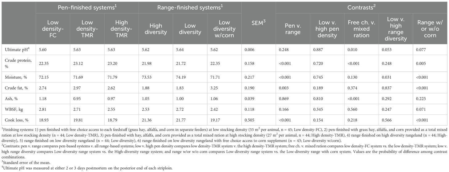 Carcass traits, lean and external fat color, ultimate pH, proximate composition, WBSF, and cook loss were analyzed as a completely randomized design using mixed model procedures of SAS (SAS Inst. Inc., Cary, NC, v 9.4). The finishing system was specified in the model as a fixed effect. Heifer/carcass served as the experimental unit. Peak temperature was tested as a covariate for WBSF and cook loss but was not significant and omitted from the model. Least-squares means were calculated, and five orthogonal contrast statements were used to test hypotheses: 1) all pen-based systems vs. all range-based systems, 2) Low stocking density-TMR vs. High stocking density-TMR, 3) Low density-FC vs. Low density-TMR, 4) Low-diversity range vs. High-diversity range, and 5) Low-diversity range vs. Low-diversity range with corn supplementation. Statistical significance was considered at an alpha level of < 0.05 for all contrasts, with tendencies considered at alpha levels ranging from 0.05 to 0.10.