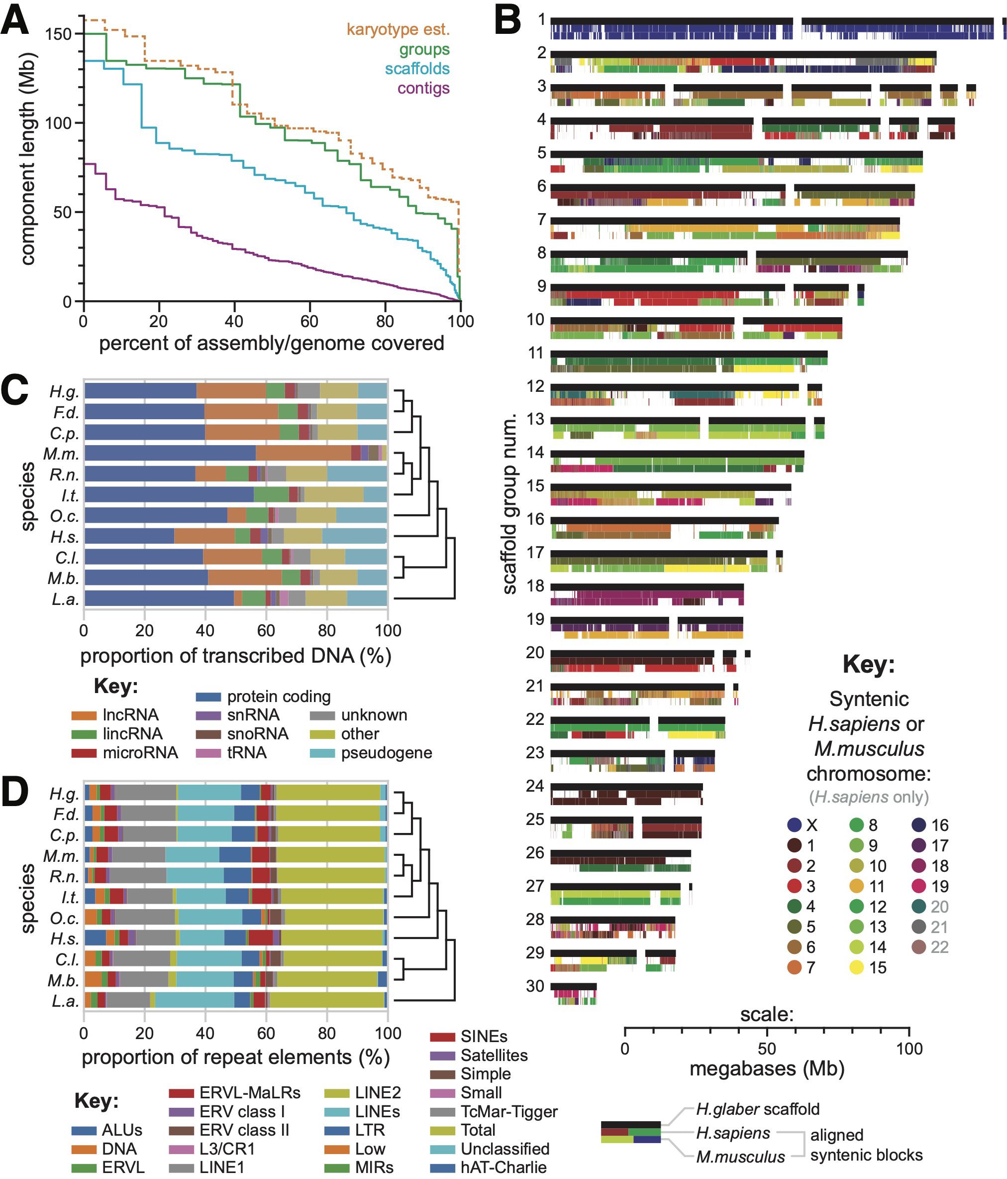 Figure 1. (A) Relative length distributions for contigs (magenta), scaffolds (cyan), and scaffold groups (green) in our reference H. glaber genome assembly. In orange: the relative length distributions for chromosomes based on analysis of karyotypes. (B) Scaffold groups based on sorted chromosome-seq. Black bars represent scaffolds, drawn to scale with their lengths. Colored bands below each scaffold bar indicate regions of syntenic alignment to human (middle band) or mouse (bottom band) reference genomes, color-coded by the aligned human/mouse chromosome. (C) Proportion of transcribed DNA dedicated to various gene/transcript categories, as annotated by CAT, across all species included in our multigenome alignment. (D) Distribution across classes of repetitive elements labeled by RepeatMasker, as annotated by CAT, across all species included in our multigenome alignment.
