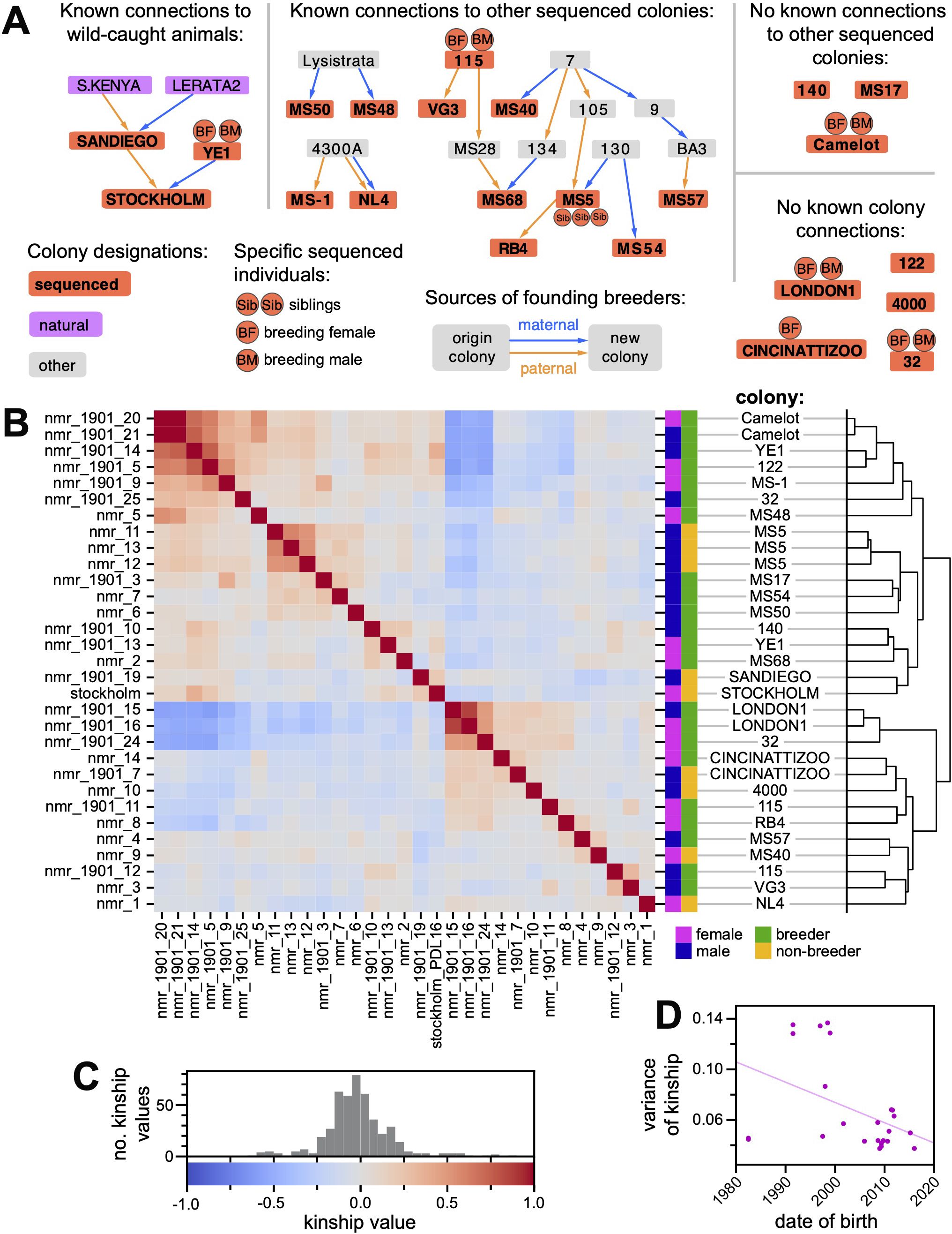 Figure 2. (A) Partial pedigree of the Kenya-derived H. glaber collection. Nodes in this pedigree represent family colonies (composed of a breeding pair and their offspring). Red nodes depict colonies that contain animals selected for whole-genome sequencing; abutting circles indicate when breeders or siblings were sequenced. Arrows show the origin colony for the breeding male (orange) and female (blue) and the new colony created by the union of these breeders. This panel includes networks linking sequenced colonies; the full pedigree is provided as Supplementary Figure 2. (B) A heatmap of pairwise kinship values (rw) between the 31 sequenced H. glaber ndividuals from the Kenya-derived collection. Hierarchical clustering of animals based on kinship is shown on the right. The key for color intensity values for the heatmap is shown in panel (C) The key for color intensity values for the heatmap in panel (B), with a histogram showing the distribution of observed values. (D) Plot of, for each animal, its date of birth (x-axis) versus the variance (y-axis) of its distribution of nonself kinship values (either rows or columns of panel B). Line shows linear regression (slope = −0.0016; y-intercept at 1980 = 0.106; slope SE = 0.00072; p-value = 0.036).