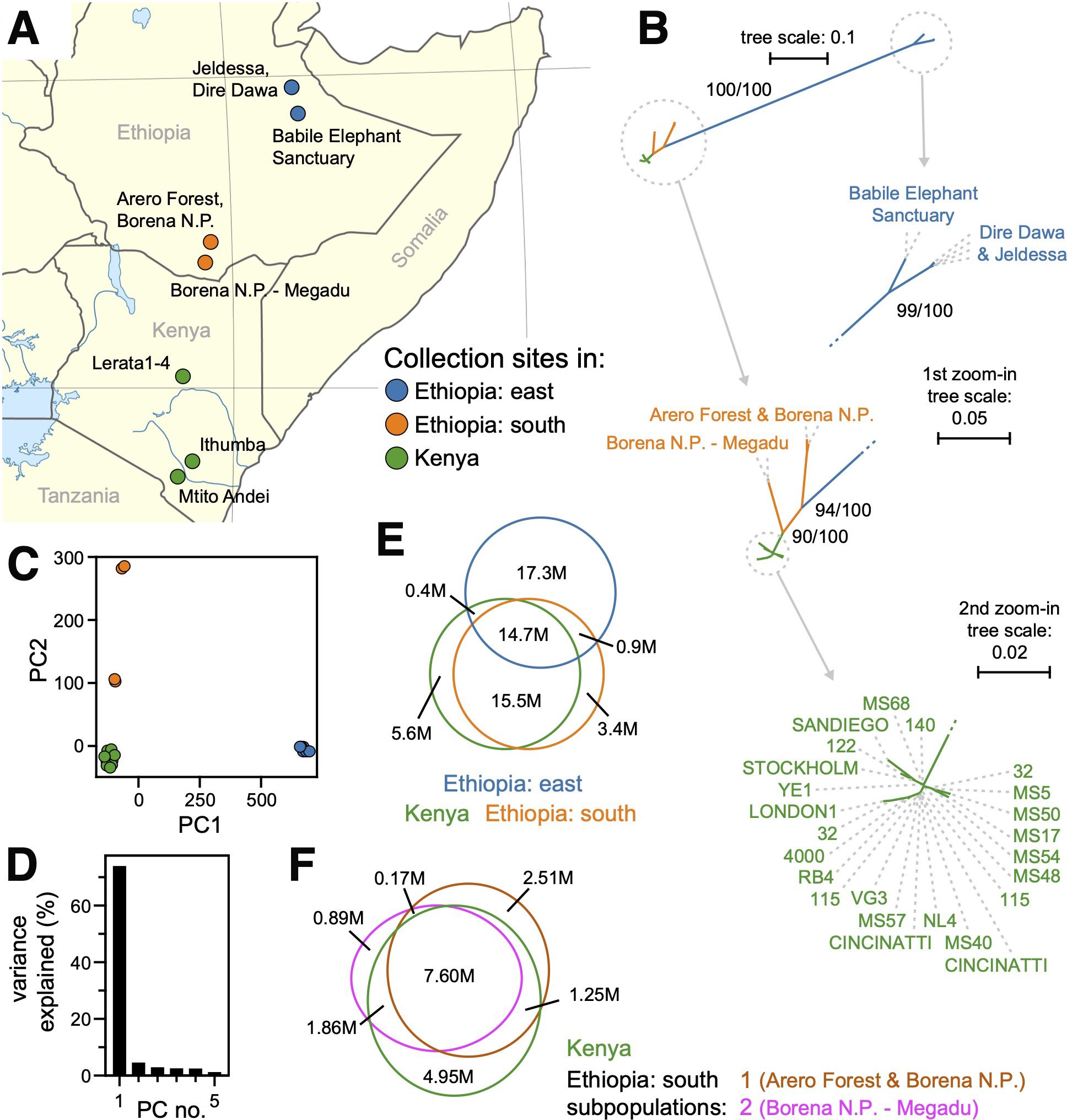For the eastern Ethiopian samples, phylogenetic clustering (Figure 3B) and observed versus expected heterozygosity (0.16 versus 0.34 for Ho and He, respectively; Table 1A) indicated that the two geographical populations, derived from either Jaldessa/Dire Dawa or the Babile Elephant Sanctuary (Figure 3A), were also likely genetically distinct. However, due to their relative proximity to one another versus their distant relationships to the other populations we studied, this population structure could not have confounded our analysis of the southern Ethiopian and Kenyan populations and therefore was not analyzed further.