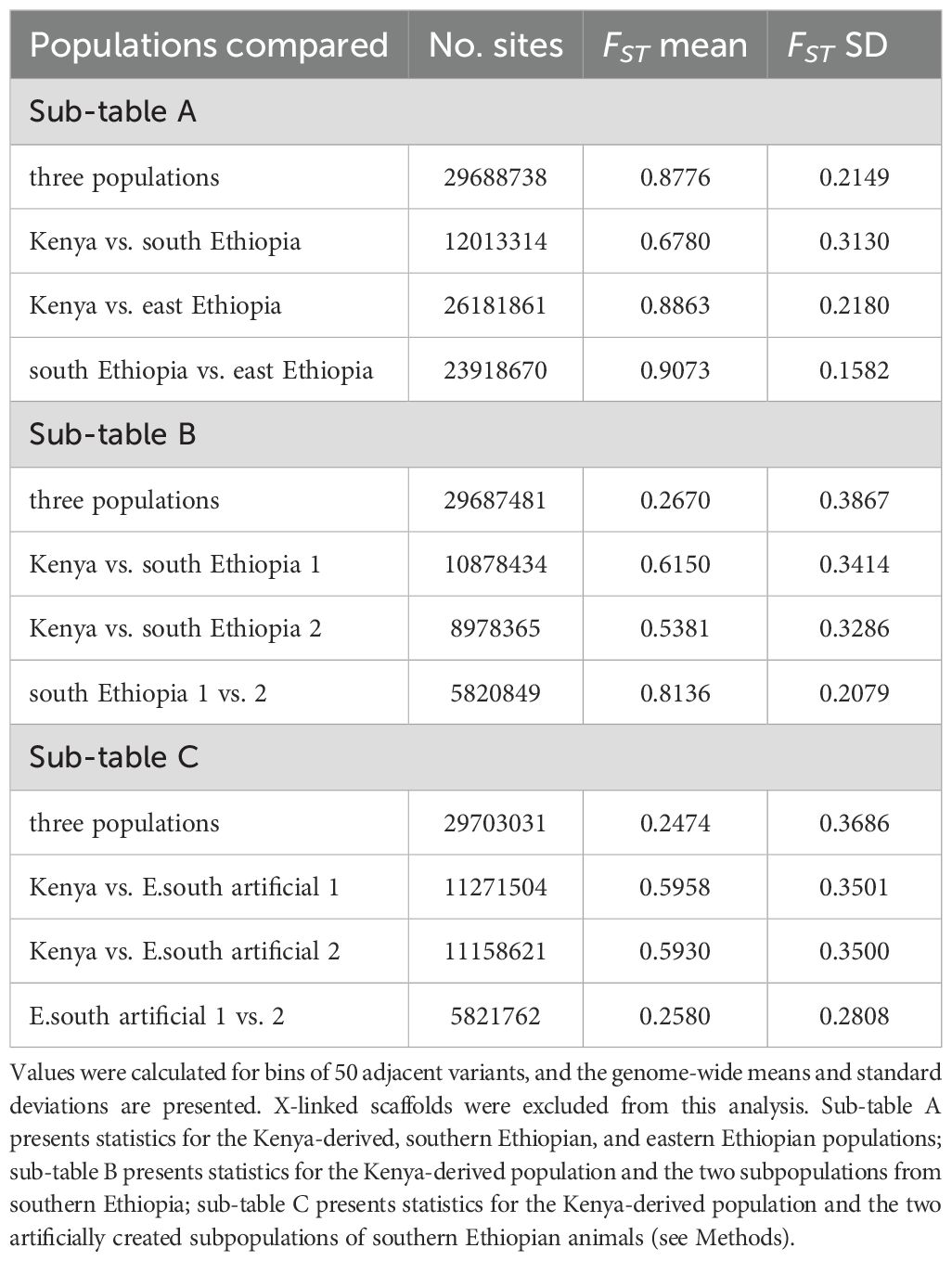 Heterozygosity, FST and f3 analyses were performed across geographically defined populations of animals from either Kenya, southern Ethiopia, or eastern Ethiopia, as annotated in Supplementary Table 4, with high-kinship animals excluded from the Kenyan roster as described above. Additional analyses were performed comparing the same Kenyan population to two subpopulations from southern Ethiopia: southern Ethiopian population 1 included animals 3119 and 2953; population 2 included animals 3172 and 3205. As a control against small-number effects, the pairings for the southern Ethiopian subpopulations were swapped, producing two artificial populations. Artificial population 1 included animals 3119 and 3172, and artificial population 2 included animals 2953 and 3205.
