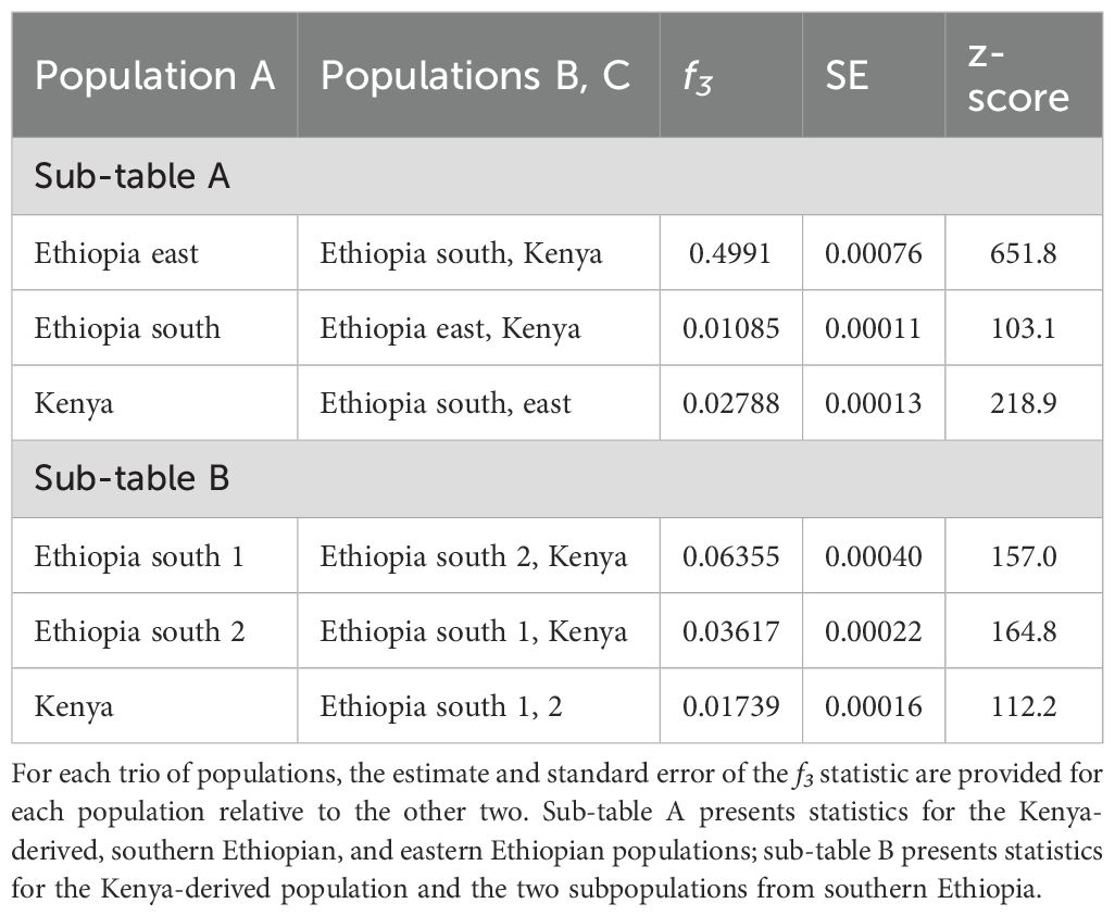 The possibility of admixture between these three population groups was evaluated using the f3 statistic (Patterson et al., 2012), calculated for each of the three geographically delimited populations with respect to the other two. In all cases, f3 was significantly greater than zero (Table 2A). This result indicated no recent admixture between these groups, with the east Ethiopian population again standing out as the most highly diverged.